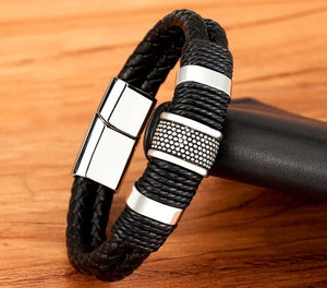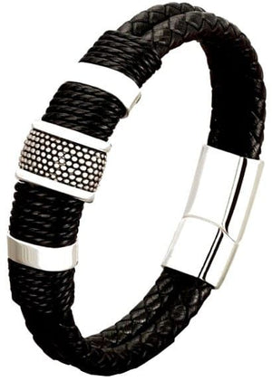 Ši odinė apyrankė su nerūdijančio plieno užsegimu yra elegantiškas ir akį traukiantis aksesuaras, puikiai tinkantis prie įvairių stilių ir aprangos.