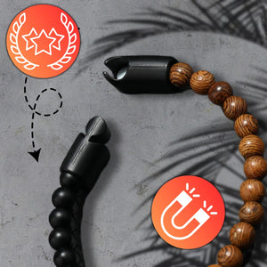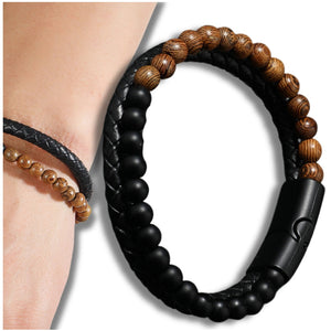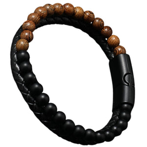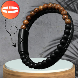 Apyrankė puikiai tinka tiek kasdieniam, tiek elegantiškam stiliui. Magnetinis užsegimas užtikrina lengvą uždėjimą ir nuėmimą, o kartu garantuoja, kad apyrankė liks savo vietoje net intensyvių veiklų metu. Juodos pintos odos ir matinių karoliukų bei gražių rudų akmenų derinys sukuria unikalų kontrastą, kuris traukia akį ir suteikia apyrankei išskirtinį charakterį.