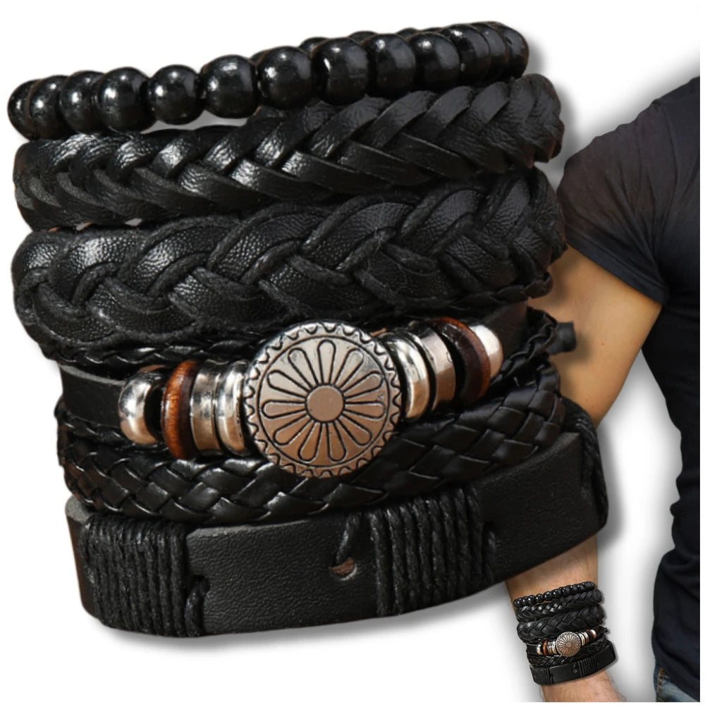 Rinkinys iš 6 vyriškų odinių apyrankių su karoliukais ir metaliniu dekoru.