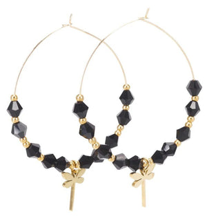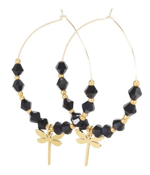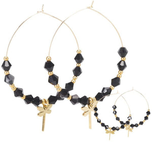 Šie elegantiški auskarai yra apskritimo formos, kurių skersmuo siekia 4,5 cm. Jie dekoruoti subtiliais juodais karoliukais ir žaviu laumžirgio motyvu, suteikiančiu unikalumo ir stiliaus. Puikiai tinka tiek kasdieniam, tiek vakariniam įvaizdžiui.