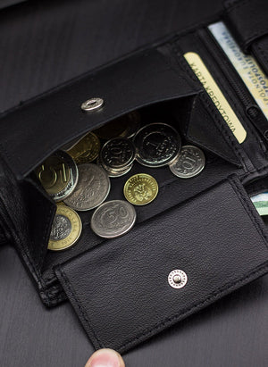 - 1 užtrauktuku užsegamas skyrius centrinėje piniginės dalyje smulkiems dokumentams.