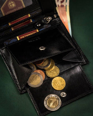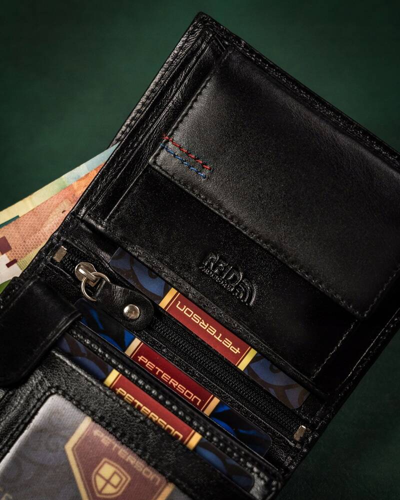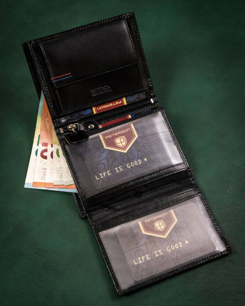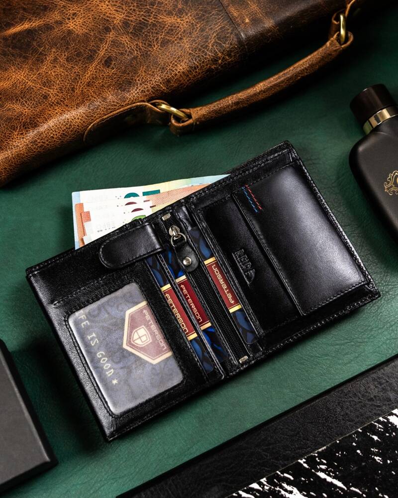 Ši Peterson piniginė yra pagaminta iš aukštos kokybės natūralios odos, kuri užtikrina ilgaamžiškumą ir eleganciją. Juodos spalvos dizainas suteikia klasikinį ir universalų stilių, tinkantį bet kokiai progai.