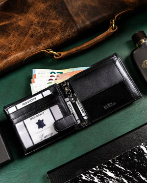 Vyriška odinė piniginė Rovicky RV172 yra elegantiškas ir funkcionalus aksesuaras, pagamintas iš aukštos kokybės natūralios odos. Juoda spalva suteikia klasikinį ir universalų stilių, tinkantį įvairioms progoms. Piniginė yra didelio dydžio, todėl joje patogiai tilps visos jūsų kortelės ir grynieji pinigai. Su 6-10 kortelių skyriais ir RFID apsauga, jūsų asmeniniai duomenys bus saugūs. Kompaktiški išmatavimai (10 cm x 12 cm x 2 cm) leidžia lengvai nešiotis piniginę kišenėje ar krepšyje.