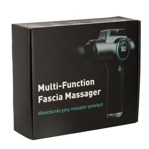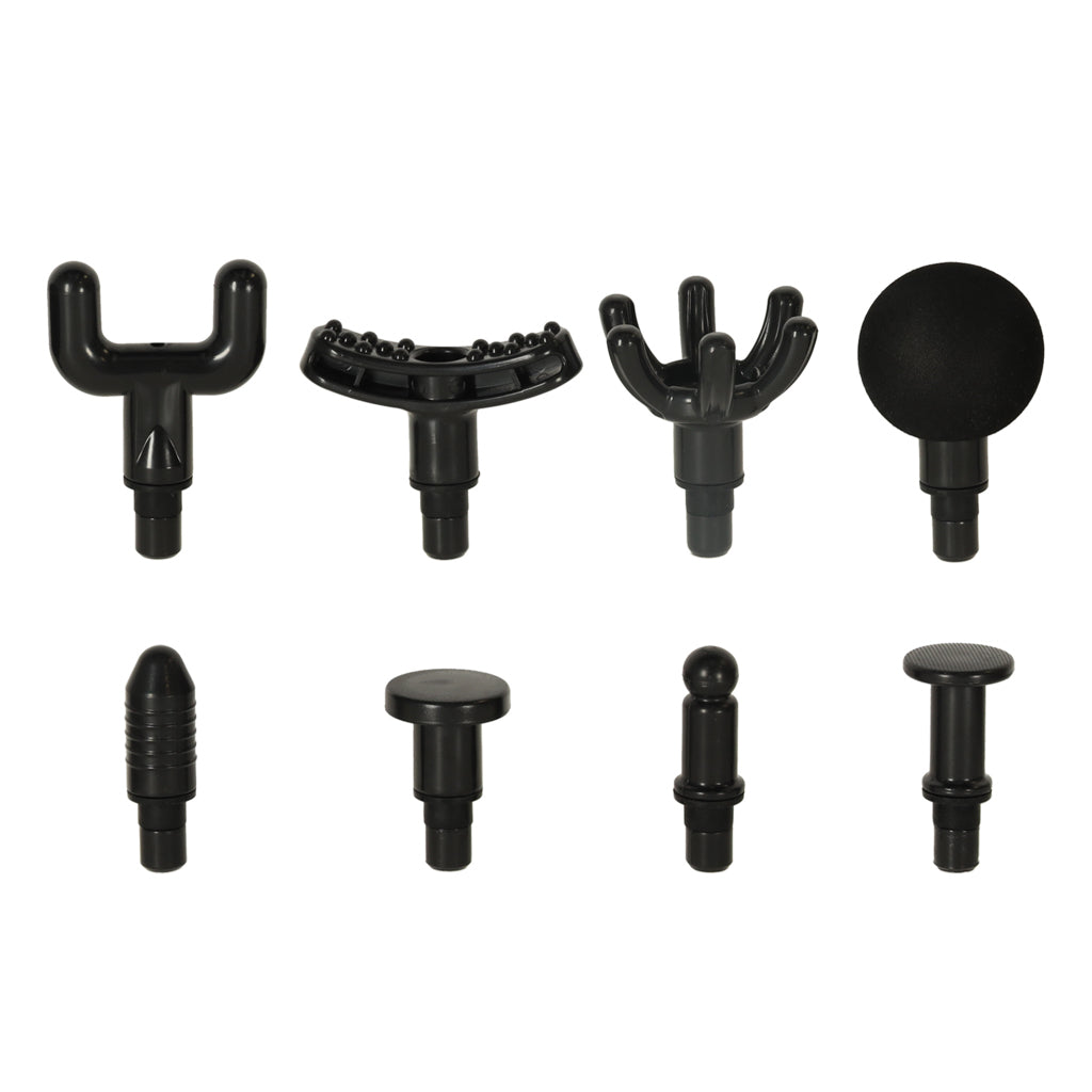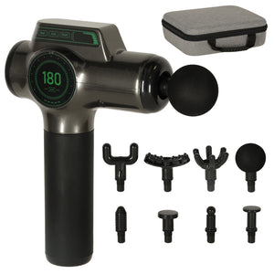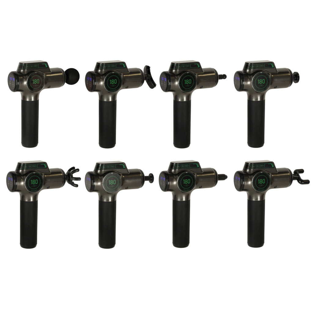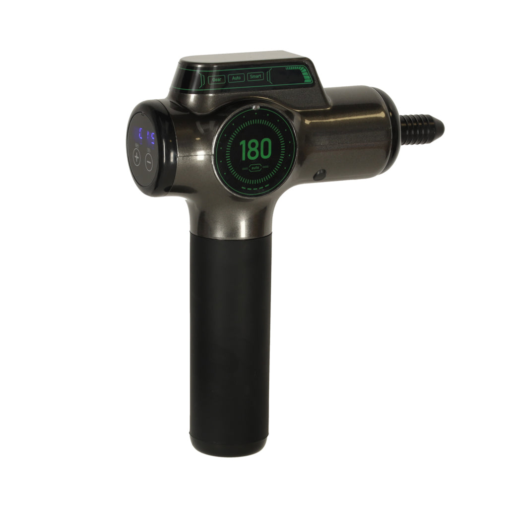 Masažo pistoletas su 8 keičiamomis galvutėmis, skirtomis įvairioms kūno dalims. Prietaisas turi galios reguliavimą nuo 1 iki 99. Ekranas rodo baterijos įkrovos lygį (nerekomenduojama naudoti prietaiso, kai baterijos lygis nukrenta žemiau 20%). Viskas supakuota į praktinį dėklą, kuris palengvina laikymą.