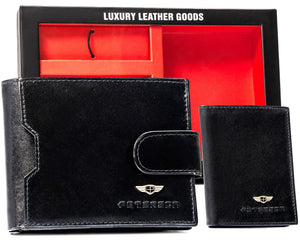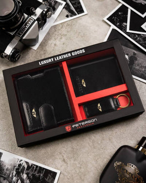 Dovanų rinkinys: vyriška odinė piniginė, dėklas ir raktų pakabukas - Peterson P18