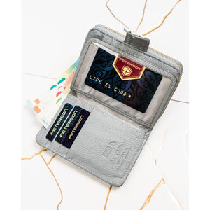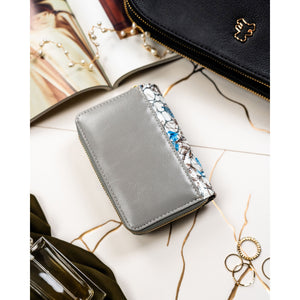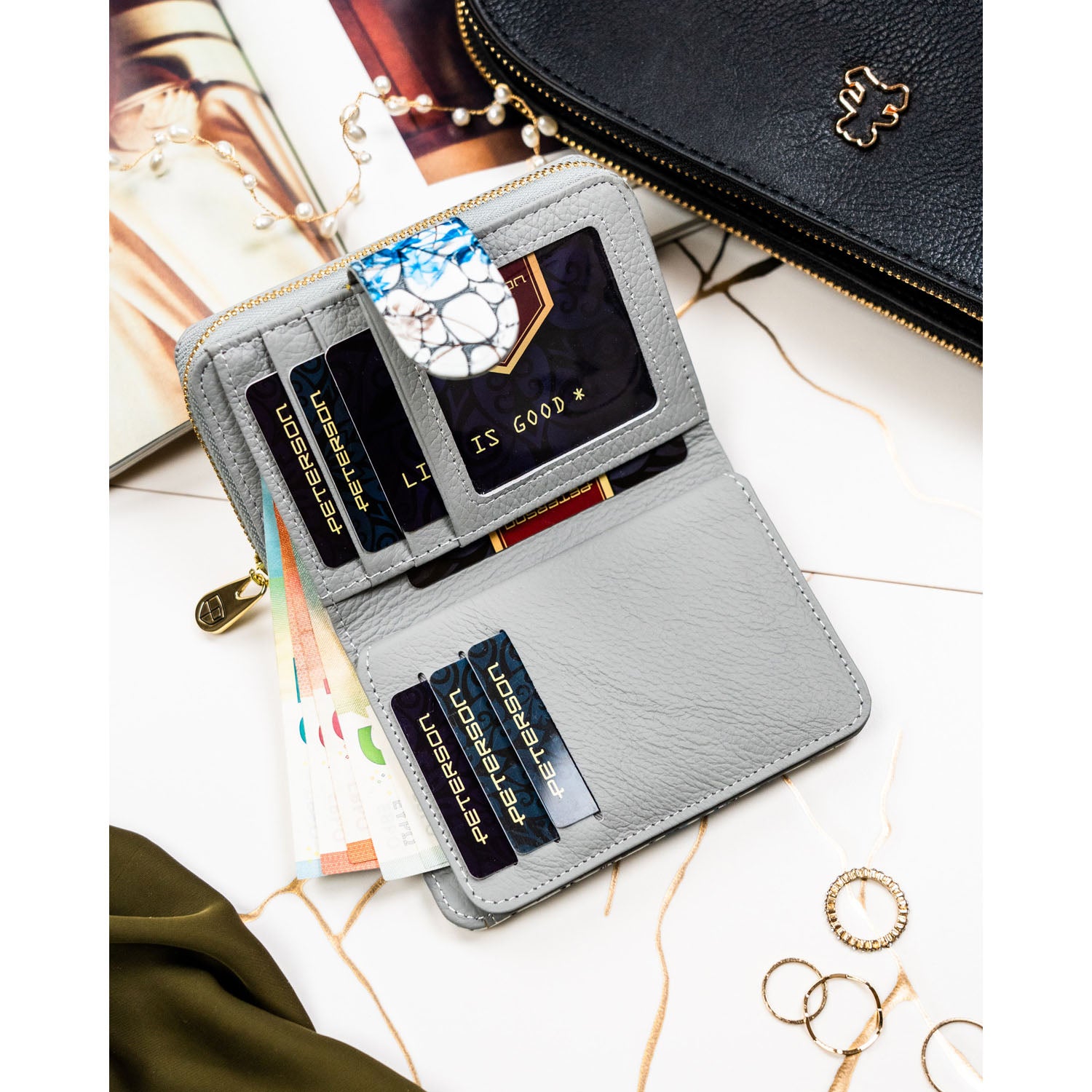 Peterson moteriška piniginė iš natūralios odos, mėlynos spalvos, su užsegimu ir užtrauktuku.