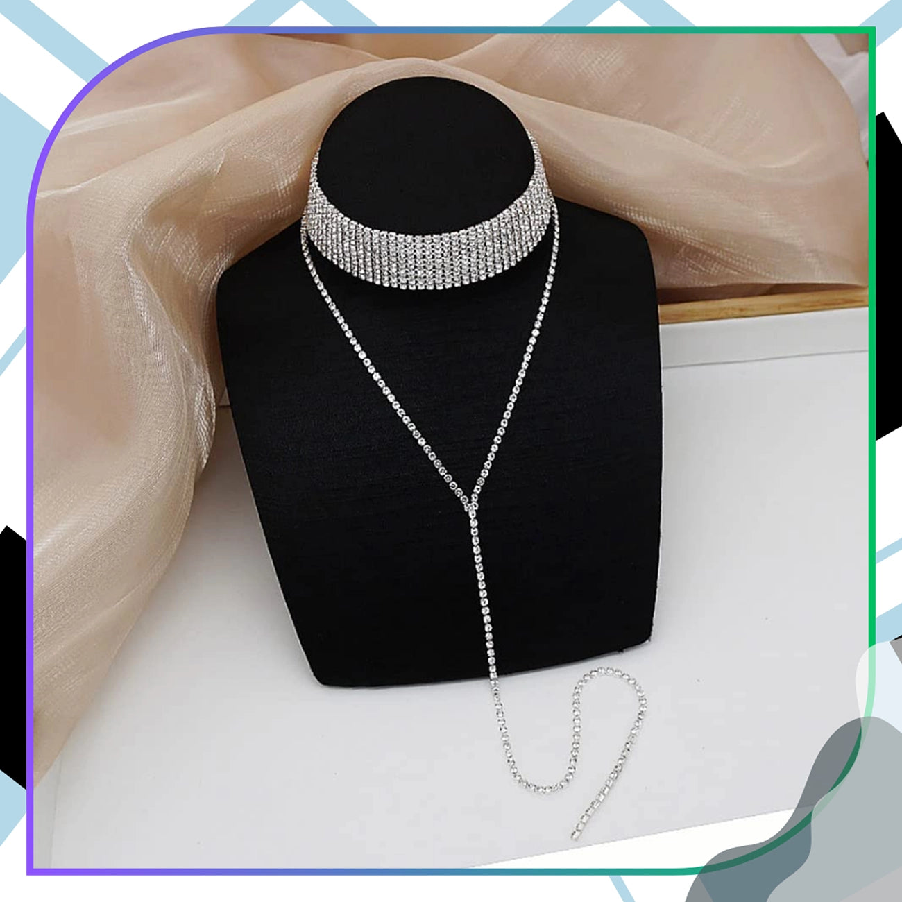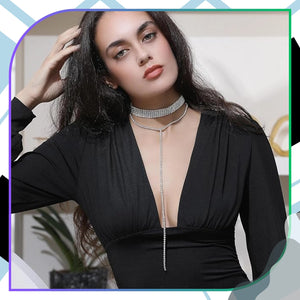 Ilgas moteriškas chokeris su cirkoniais. Jis turi 10 eilių sidabrinių cirkonių, pritvirtintų ant skaidrios juostos, sukuriant puikų efektą ant kaklo. Pratęsimas ir detalės sidabrinės spalvos.