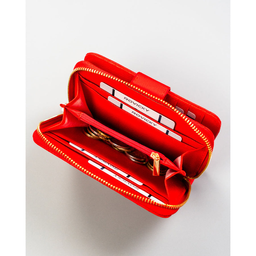 Raudona moteriška piniginė iš ekologiškos odos, horizontalaus tipo. Uždarymas: spaudė ir užtrauktukas. Paviršius su subtilia vertikalia tekstūra.