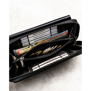 - Pirmas skyrius – užsegamas užtrauktuku, skirtas kortelėms, dokumentams ir gryniesiems pinigams.