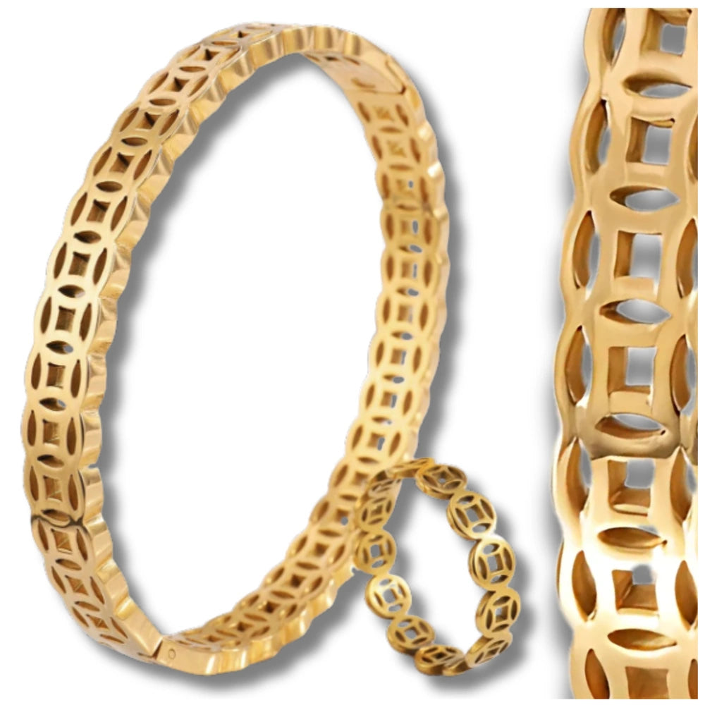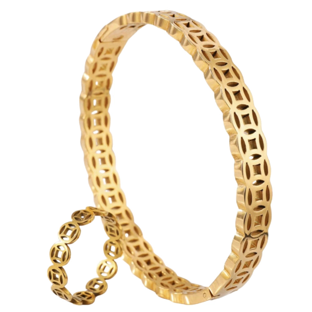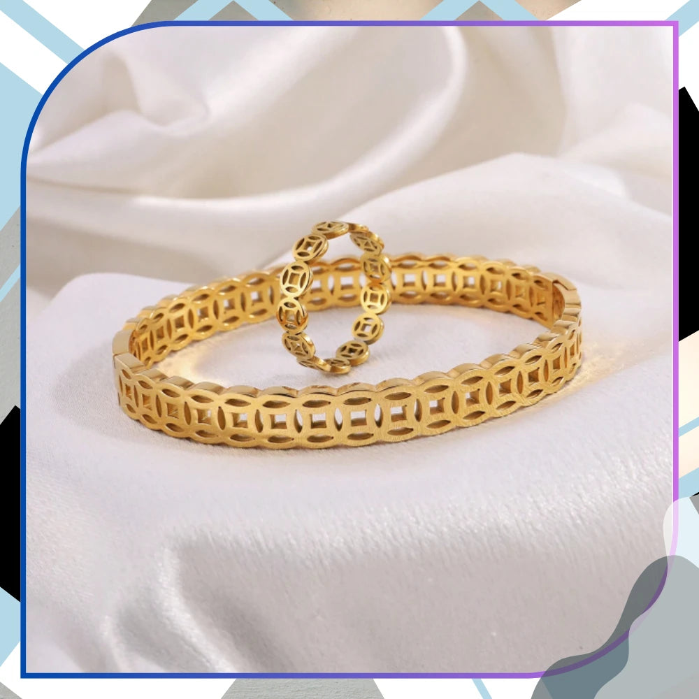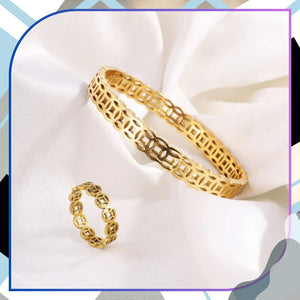 Papuošalų rinkinys: auksinė apyrankė ir žiedas, chirurginis plienas