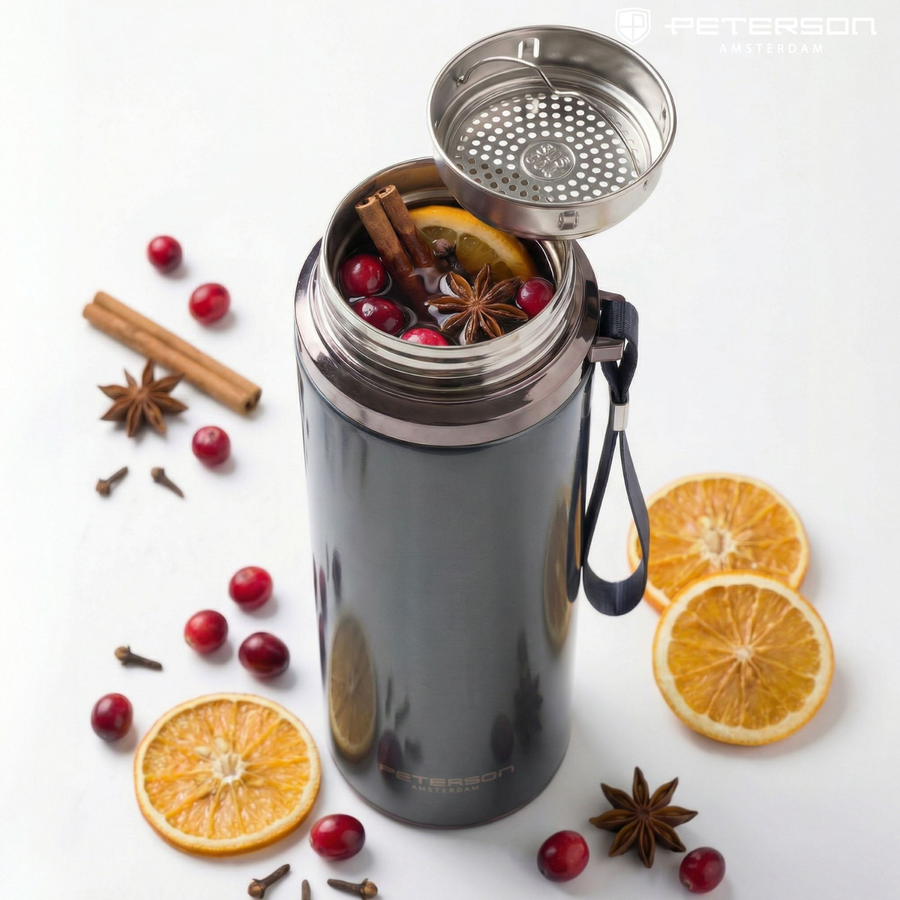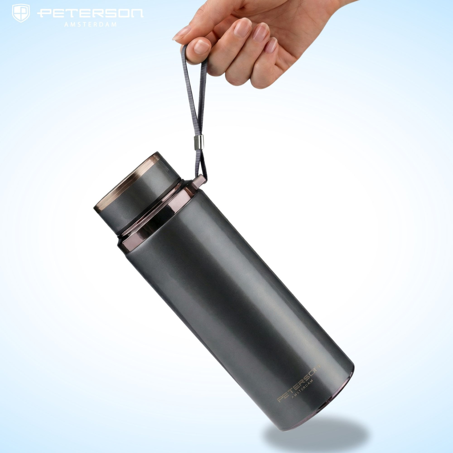 „Peterson“ 750 ml termopuodelis karštiems ir šaltiems gėrimams su sieteliu ir riešo dirželiu, pilkas, nerūdijantis plienas D88
