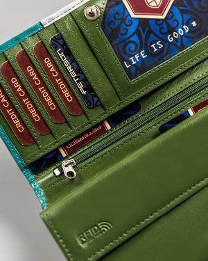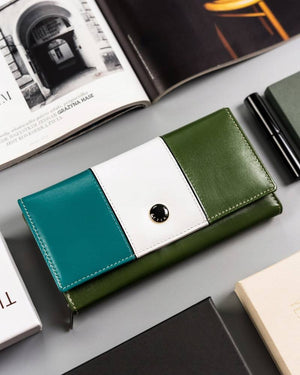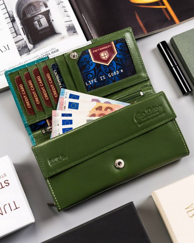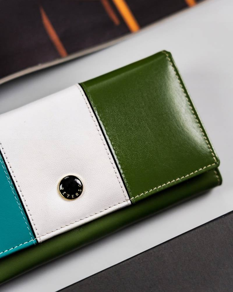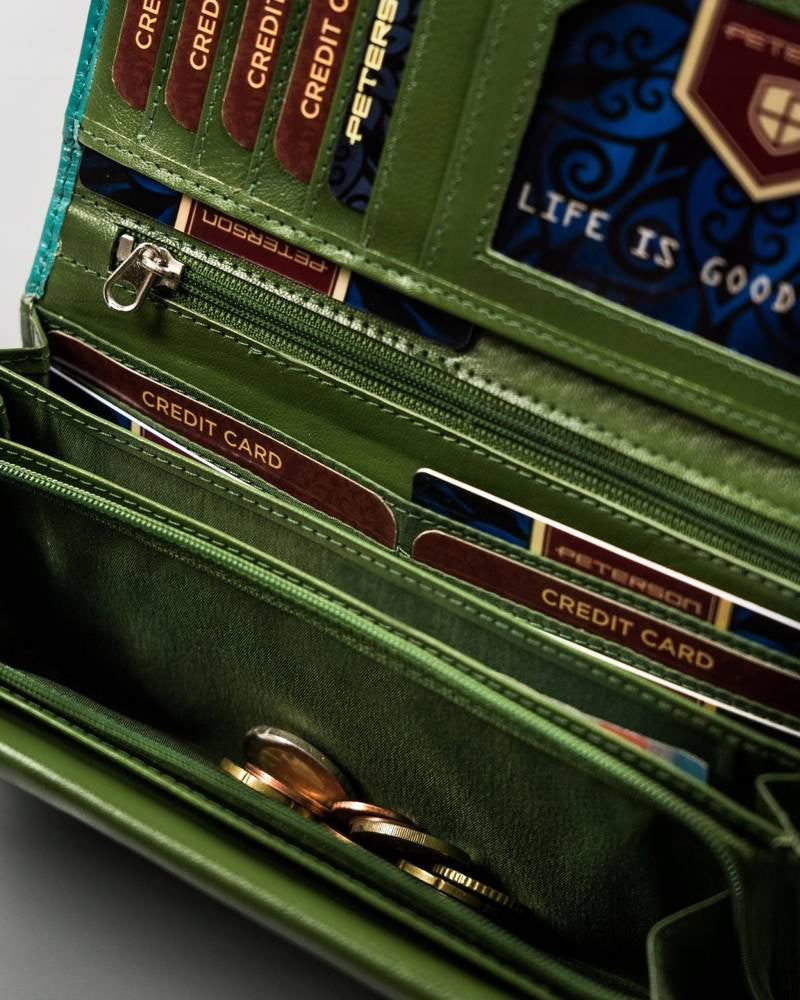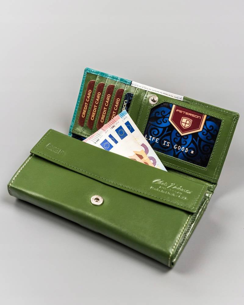 Prekės ženklas: Peterson; Medžiaga: natūrali oda; Spalva: baltas, žalias, mėlynas; Dydis: didelis; Kortelių skyrių skaičius: 6-10; Monetų skyrius: taip; Matmenys: 9 cm x 18,5 cm x 3,5 cm.