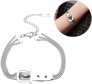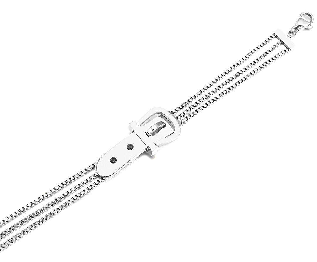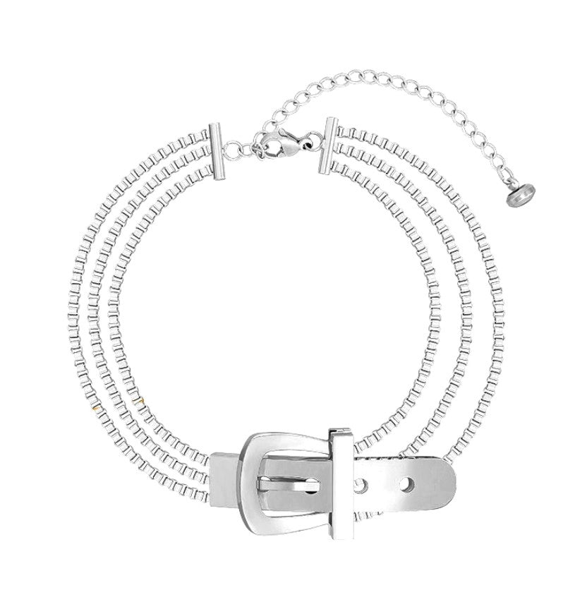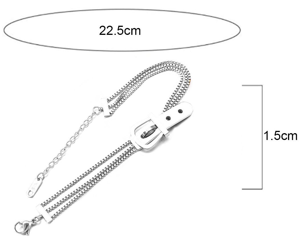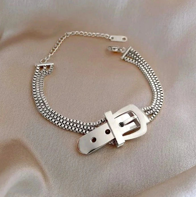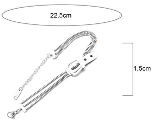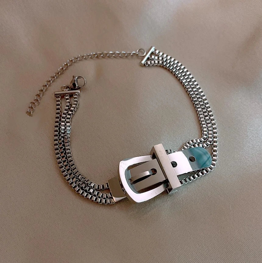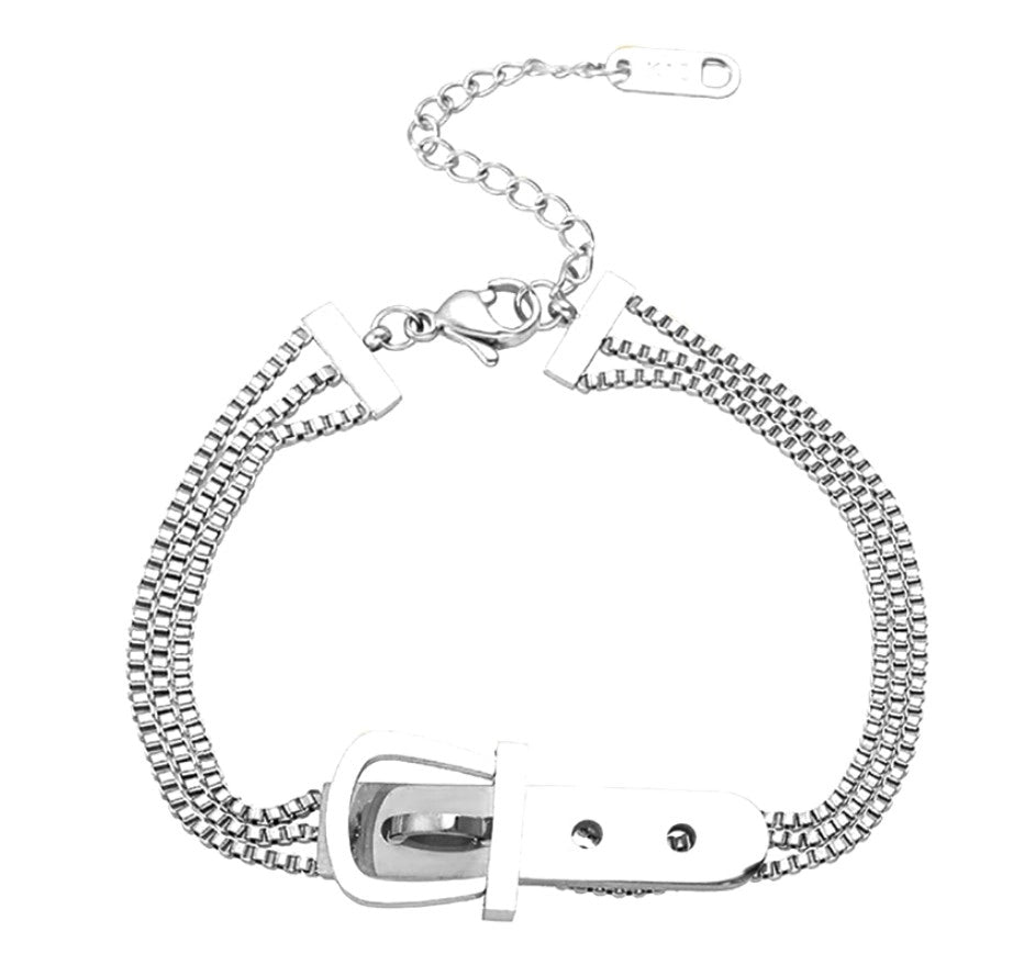 Chirurginis plienas atsparus atmosferos sąlygoms, nerūdija ir netamsėja. Apyrankė sudaryta iš dviejų dalių, susidedančių iš trijų smulkių grandinėlių, sujungtų dekoratyviniu elementu, primenančiu didelę sagtį. Sidabrinė spalva patiks moterims, vertinančioms subtilius papuošalus.