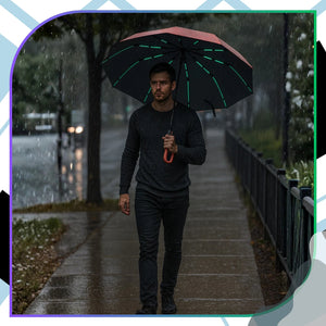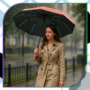Elegantiškas raudonas skėtis su žaliais elementais, puikiai apsaugantis nuo lietaus ir saulės. Skėtis turi patogią plastikinę rankeną su karabinu ir automatinio atidarymo bei uždarymo mygtuką.