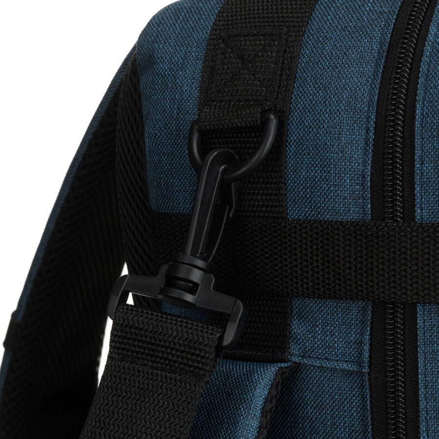 - Prisegamas ilgas diržas leidžia kuprinę nešioti per petį kaip kelioninį krepšį.