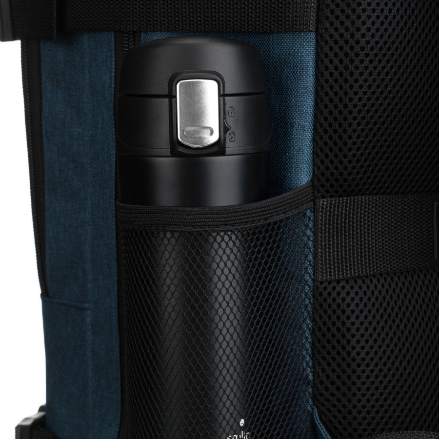 Tamsiai mėlyna kelioninė kuprinė iš poliesterio su prisegamu diržu