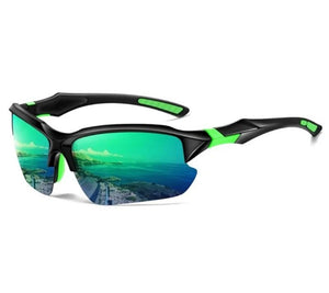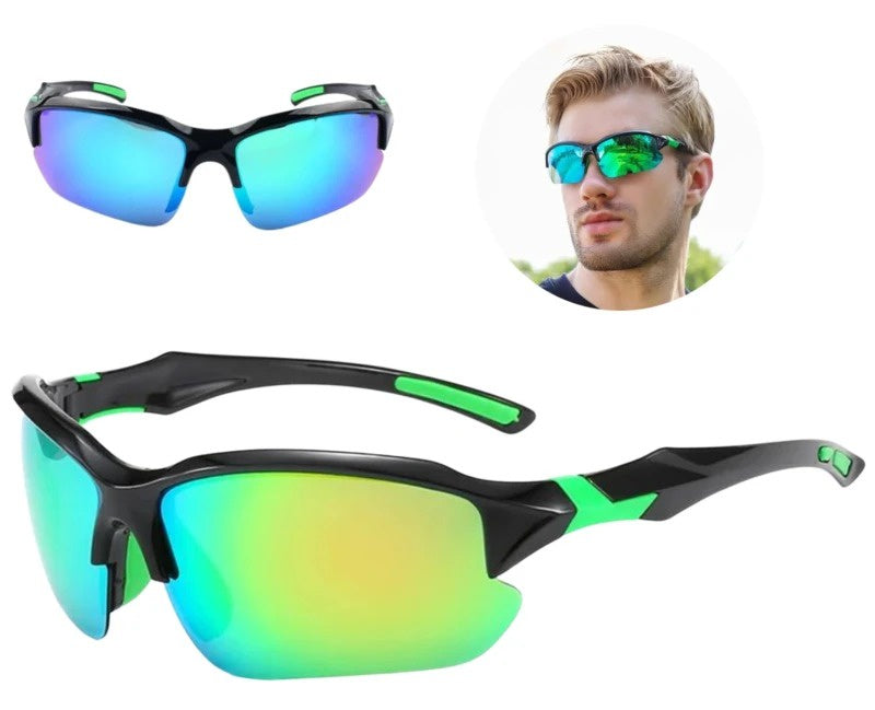 Vyriški juodi poliarizuoti akiniai su veidrodiniais žaliais lęšiais, skirti apsaugoti akis nuo saulės spindulių ir suteikti stilingą išvaizdą. Šie akiniai puikiai tinka tiek vasaros stiliui, tiek kasdieniam dėvėjimui.