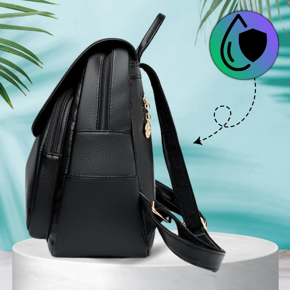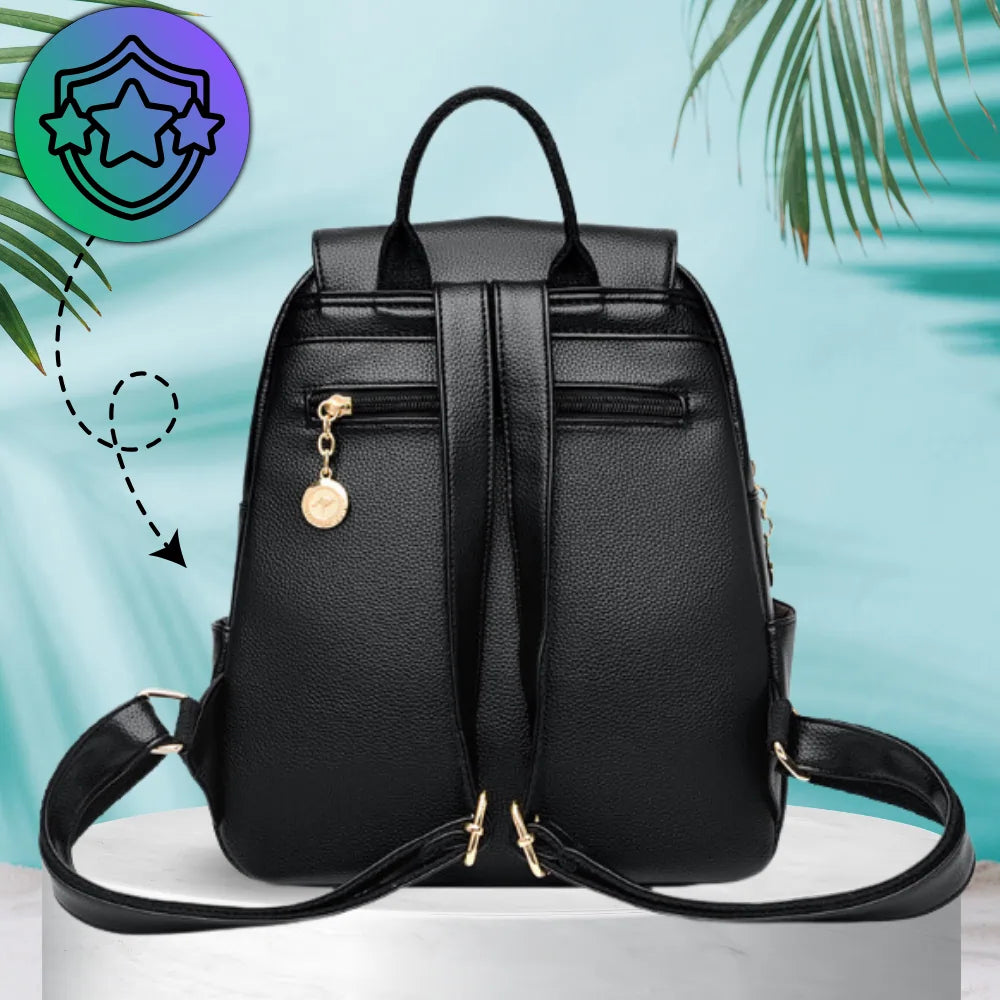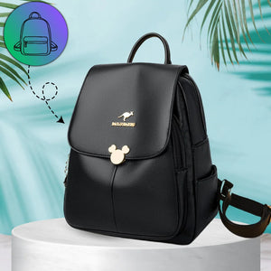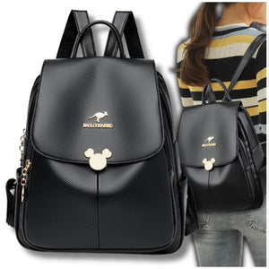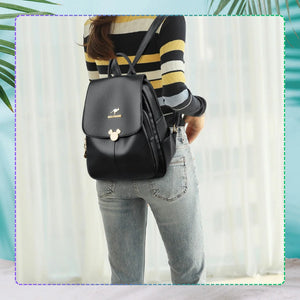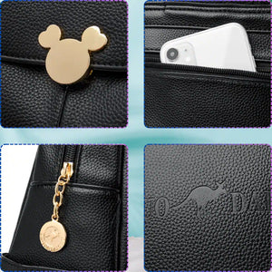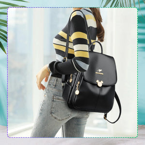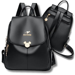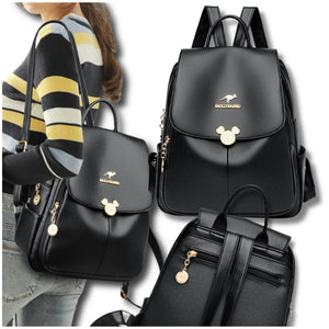 Ši kuprinė išsiskiria elegantišku dizainu ir talpumu, puikiai tinka kasdieniam naudojimui. Ji turi atvartą, kurį puošia dekoratyvinė auksinė pelės galvutė, suteikianti išskirtinumo.