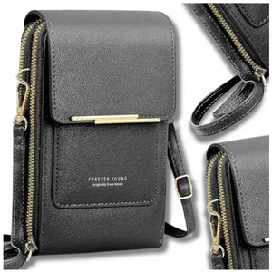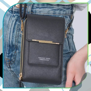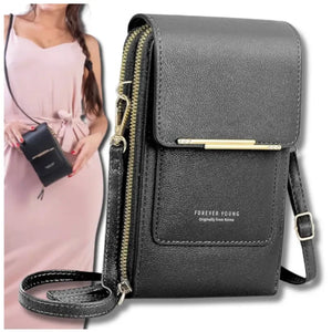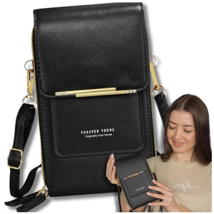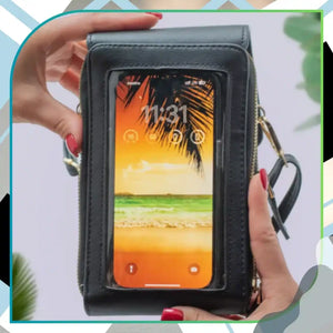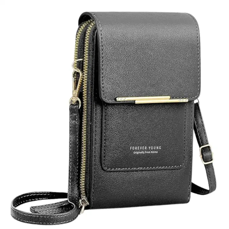 - Pirmasis skyrius: Užsegamas užtrauktuku, viduje yra du atskiri skyriai. Išorėje yra langelis, leidžiantis valdyti telefoną neišimant jo iš rankinės.