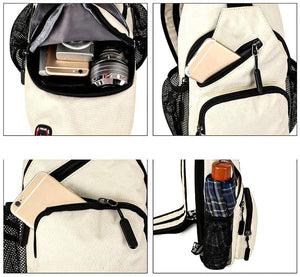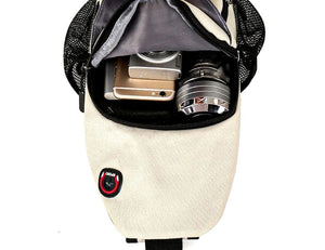 - Guminė anga ausinių laidui: leidžia patogiai prijungti ausines prie kuprinės viduje esančio telefono.