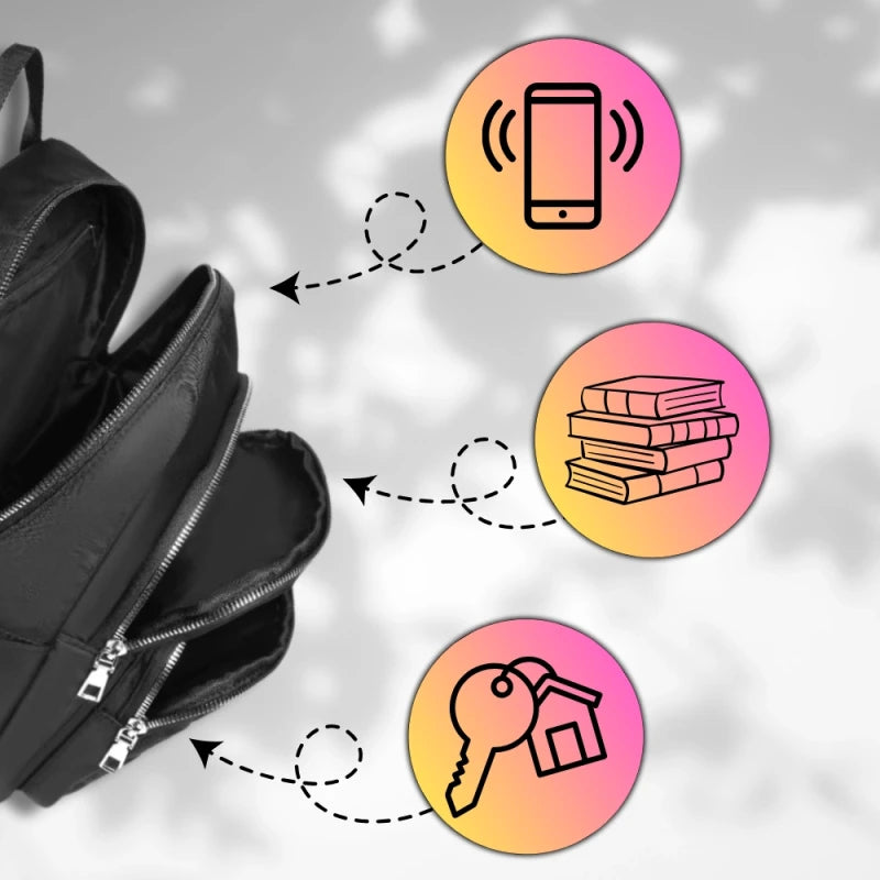 - Trys išorinės kišenės, įskaitant vieną su užtrauktuku nugaroje, užtikrina patogų daiktų laikymą.