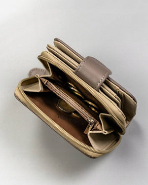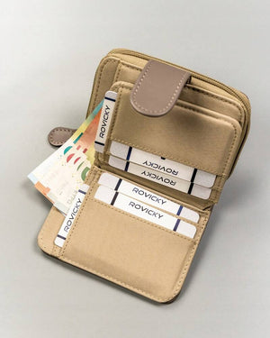 Ši smėlio spalvos piniginė yra puikus pasirinkimas moterims, vertinančioms praktiškumą ir stilių.