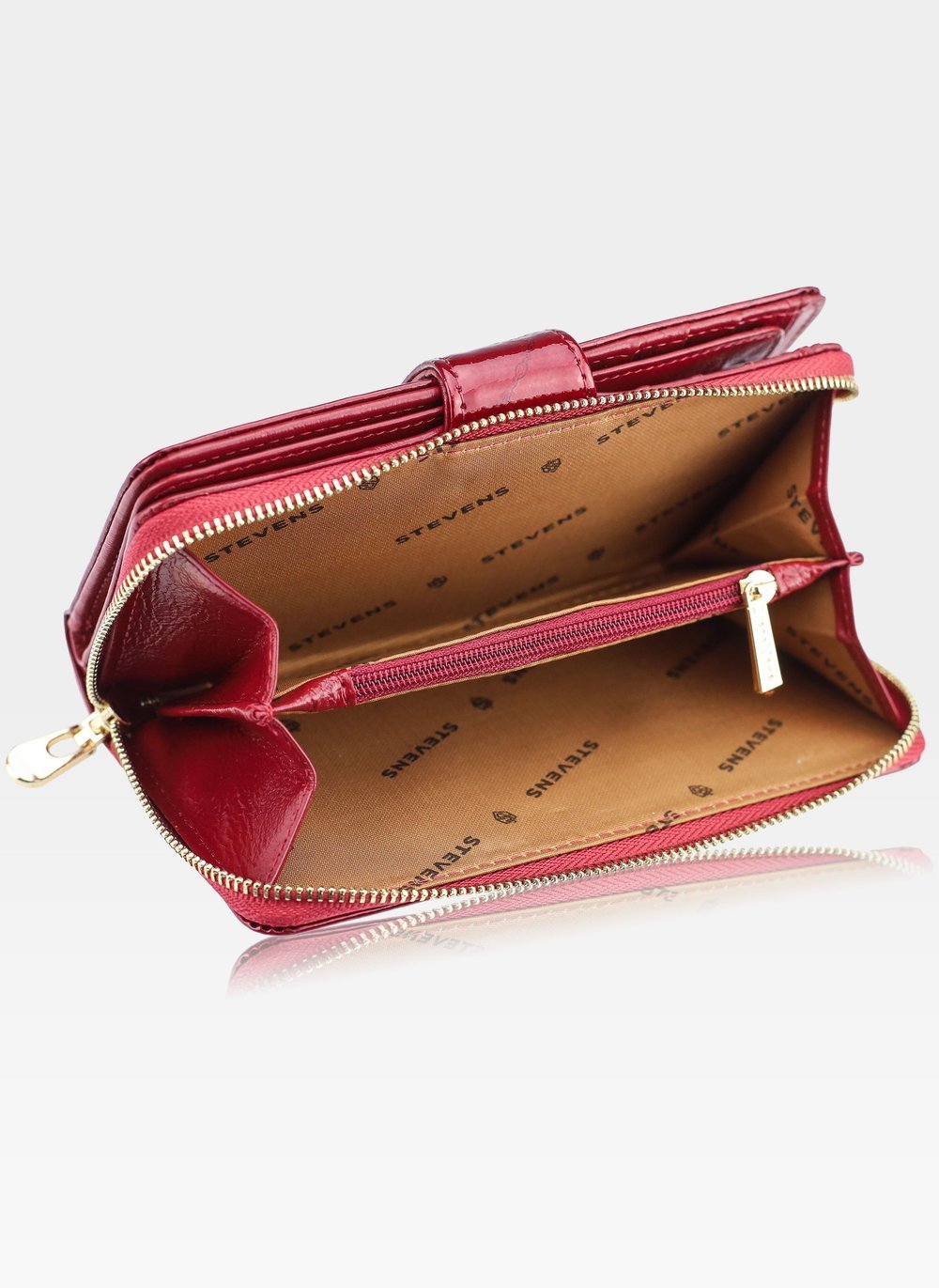 Moteriška piniginė Stevens yra funkcionalus ir stilingas aksesuaras, padalintas į dvi pagrindines dalis: kortelių ir dokumentų skyrių su segtuku bei atskirą skyrių su užtrauktuku.