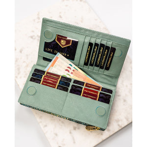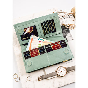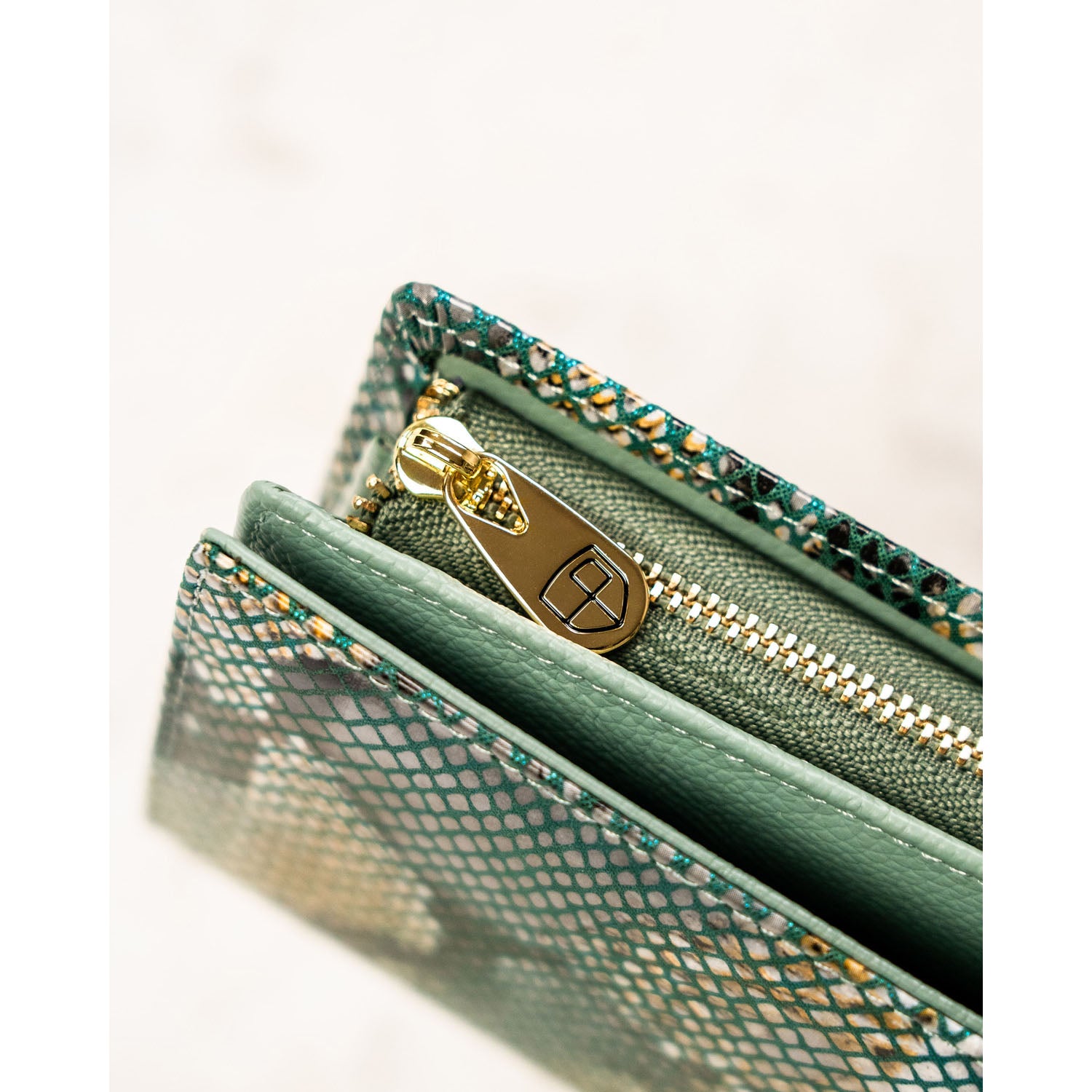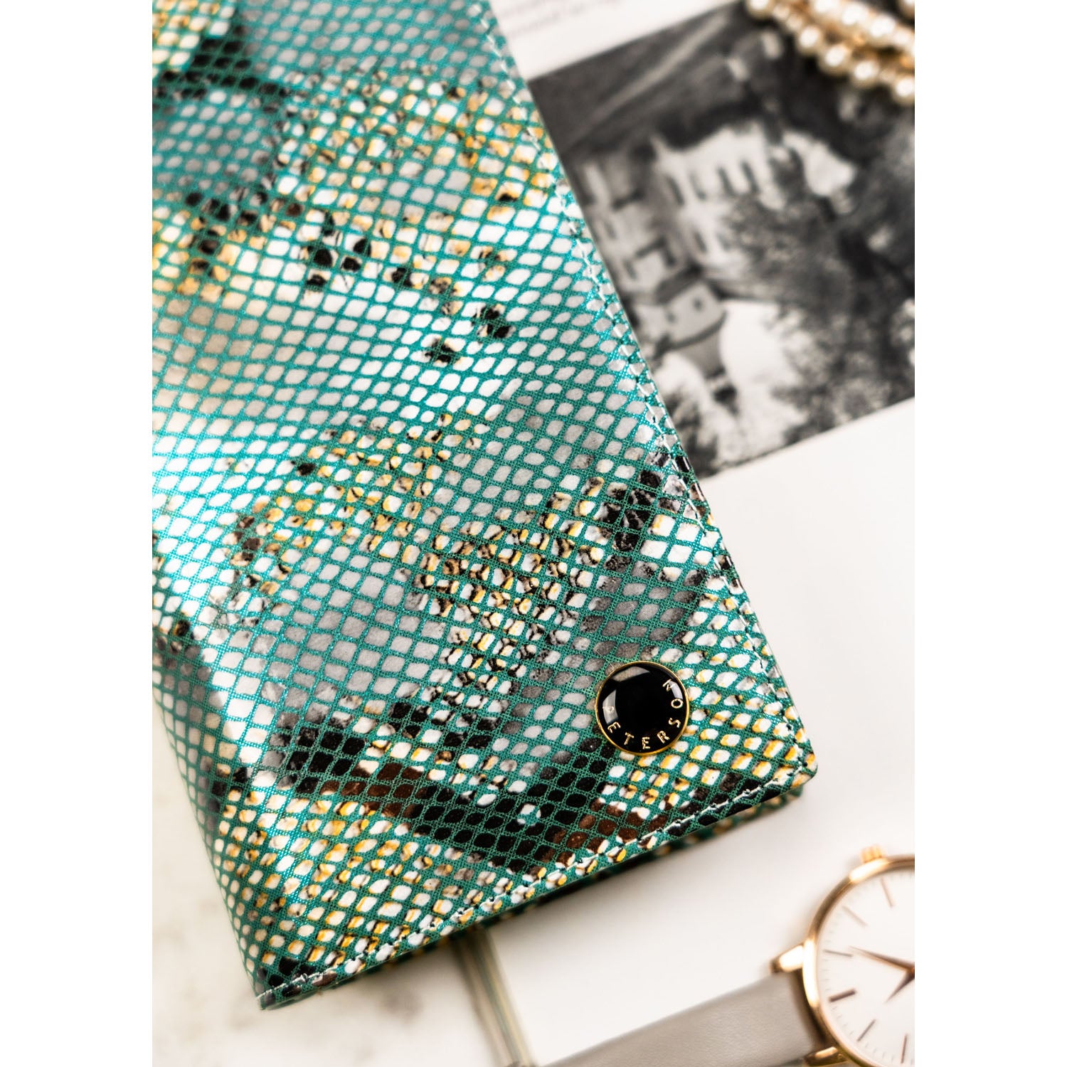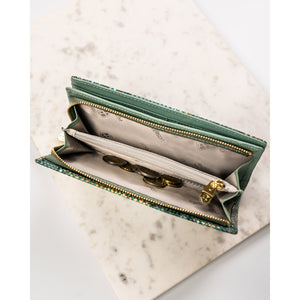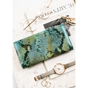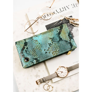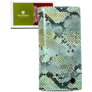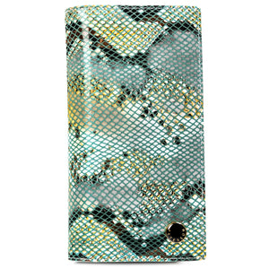 Ši moteriška vertikali piniginė su magnetu ir gyvatės odos imitacija yra puikus pasirinkimas miesto stiliaus mėgėjoms. Pagaminta iš natūralios odos, ji pasižymi elegantiška šviesiai žalia spalva ir auksinės spalvos apkaustais.