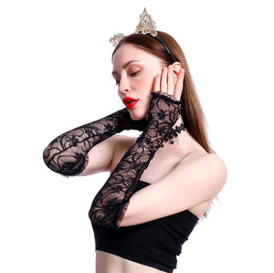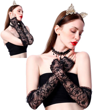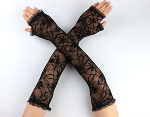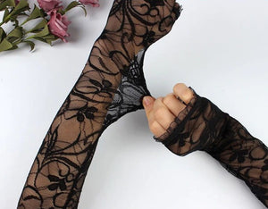 Ilgos, nėriniuotos moteriškos pirštinės, kurios suteikia elegancijos ir komforto.