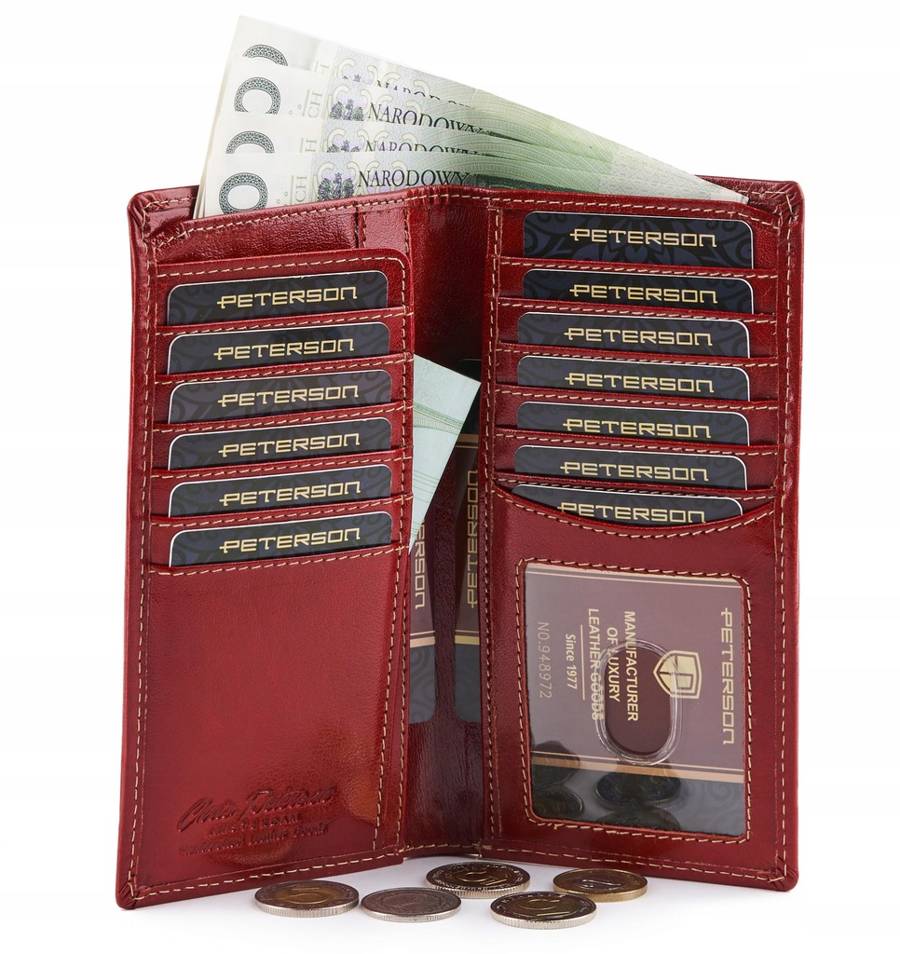 Ši elegantiška moteriška piniginė iš Peterson kolekcijos yra pagaminta iš aukštos kokybės natūralios odos. Jos ryški raudona spalva suteikia išskirtinumo, o vidutinis dydis užtikrina patogumą kasdieniam naudojimui. Piniginė turi daugiau nei 10 kortelių skyrių, tačiau neturi atskiro monetų skyriaus, todėl puikiai tinka tiems, kurie vertina minimalistinį dizainą.