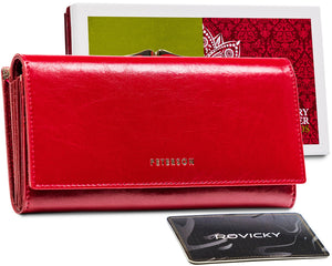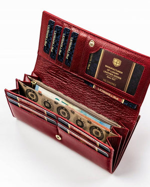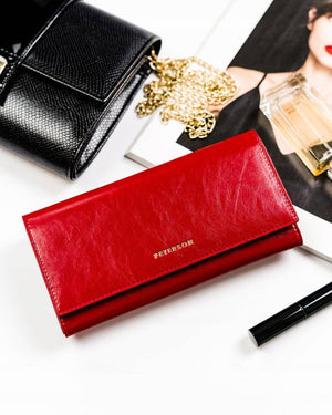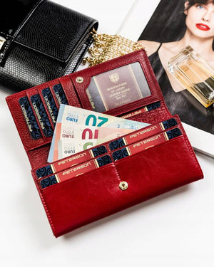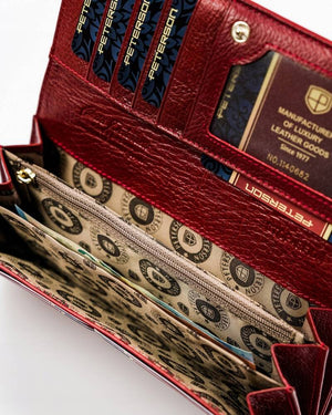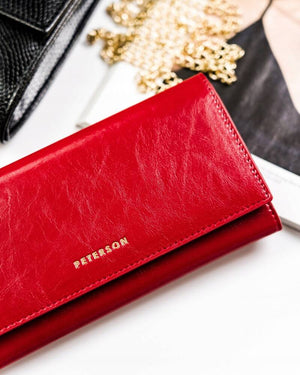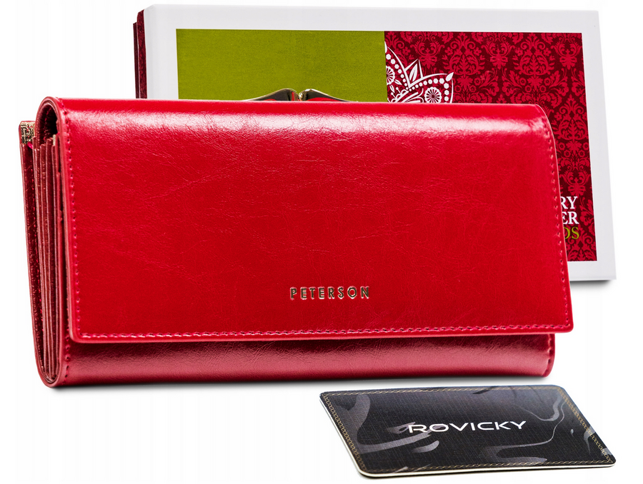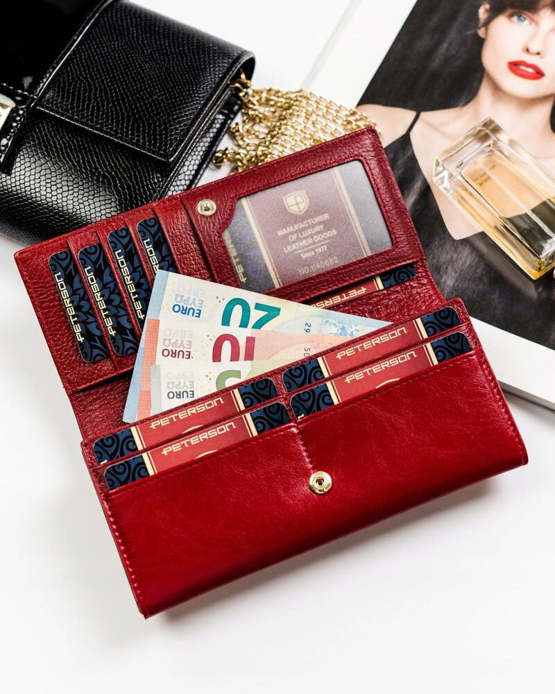 Ši elegantiška moteriška piniginė iš Peterson kolekcijos yra pagaminta iš aukštos kokybės natūralios odos. Raudona spalva suteikia išskirtinumo ir stiliaus, o didelis dydis užtikrina, kad turėsite pakankamai vietos visiems savo daiktams. Piniginėje yra 6-10 kortelių skyrių ir atskiras skyrius monetoms, todėl ji yra itin praktiška kasdieniam naudojimui.