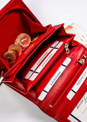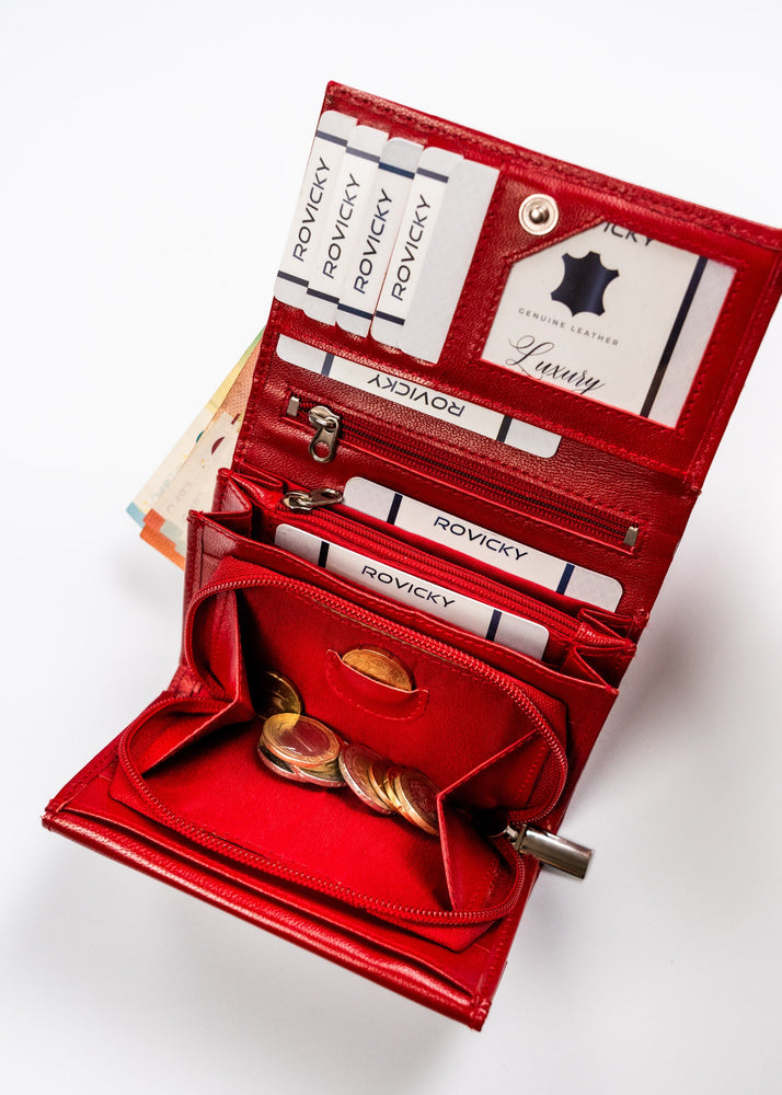 Ši elegantiška moteriška piniginė iš Rovicky yra pagaminta iš aukštos kokybės natūralios odos. Raudona spalva suteikia išskirtinumo, o vidutinis dydis užtikrina patogumą kasdieniam naudojimui. Piniginė turi RFID apsaugą, kuri padeda apsaugoti jūsų korteles nuo nepageidaujamo nuskaitymo. Su 6-10 kortelių skyriais, ji puikiai tinka organizuoti jūsų finansinius dokumentus. Kompaktiški išmatavimai leidžia lengvai tilpti į rankinę ar kišenę.