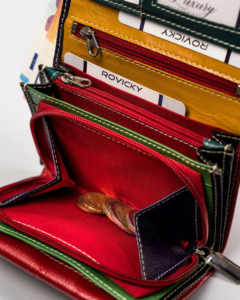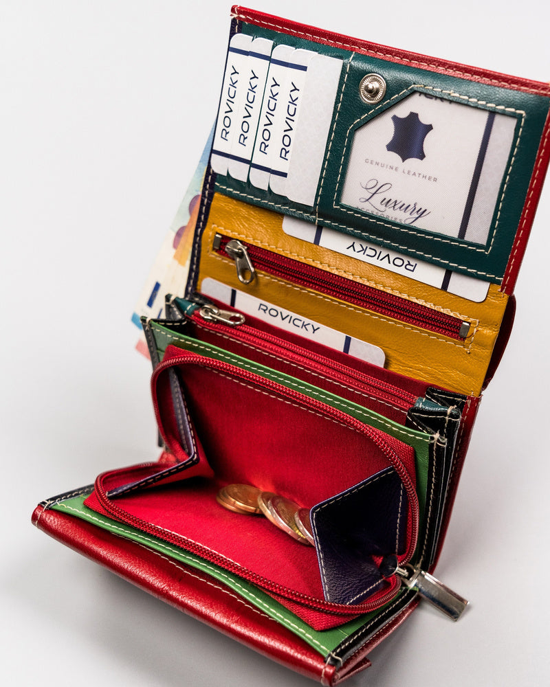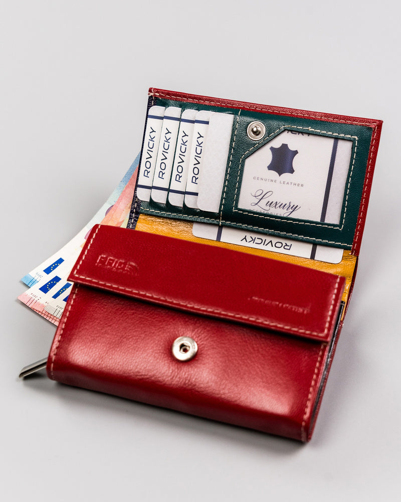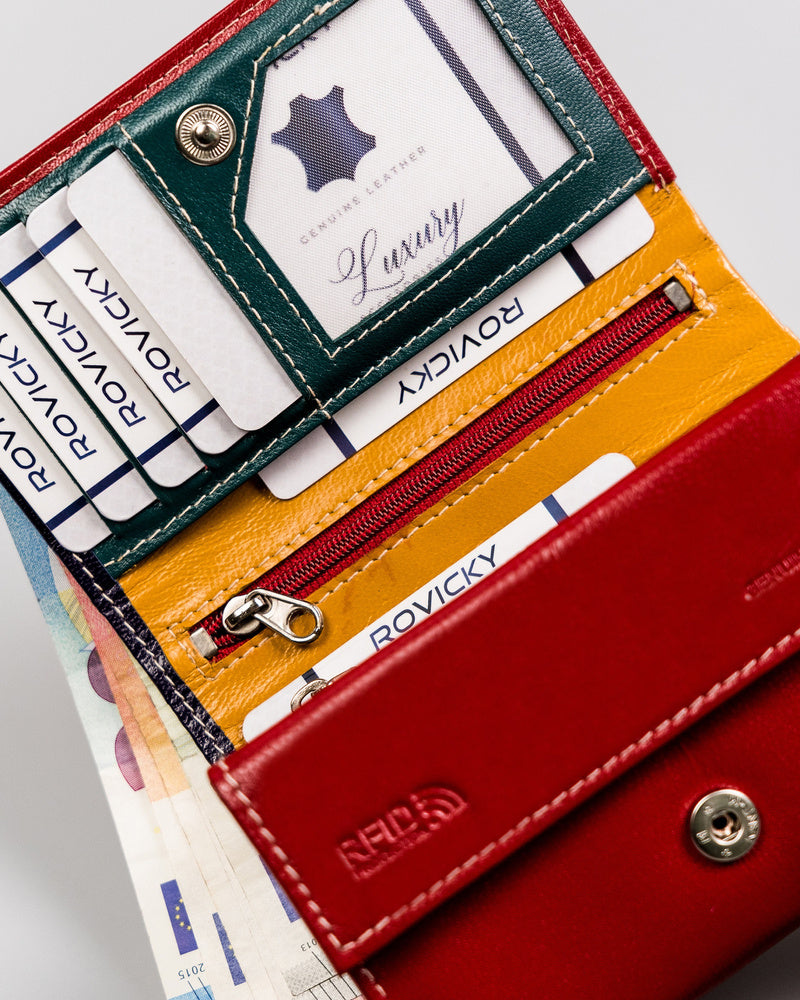Ši elegantiška moteriška piniginė iš Rovicky yra pagaminta iš aukštos kokybės natūralios odos, kuri užtikrina ilgaamžiškumą ir stilingą išvaizdą. Raudona spalva suteikia išskirtinumo, o vidutinis dydis leidžia patogiai laikyti piniginę rankinėje. Su integruota RFID apsauga jūsų kortelės bus saugios nuo nepageidaujamo nuskaitymo. Piniginėje yra 1-5 kortelių skyriai, todėl ji puikiai tinka kasdieniam naudojimui.
