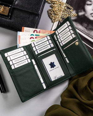 Ši elegantiška ir funkcionali piniginė moterims Rovicky L55 yra pagaminta iš aukštos kokybės natūralios odos. Jos žalia spalva suteikia išskirtinumo, o vidutinis dydis užtikrina patogumą kasdieniam naudojimui. Piniginė turi daugiau nei 10 kortelių skyrių, todėl lengvai sutalpinsite visas reikalingas korteles. Be to, RFID apsauga padės apsaugoti jūsų asmeninius duomenis nuo neteisėto nuskaitymo.