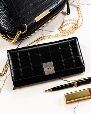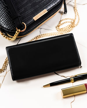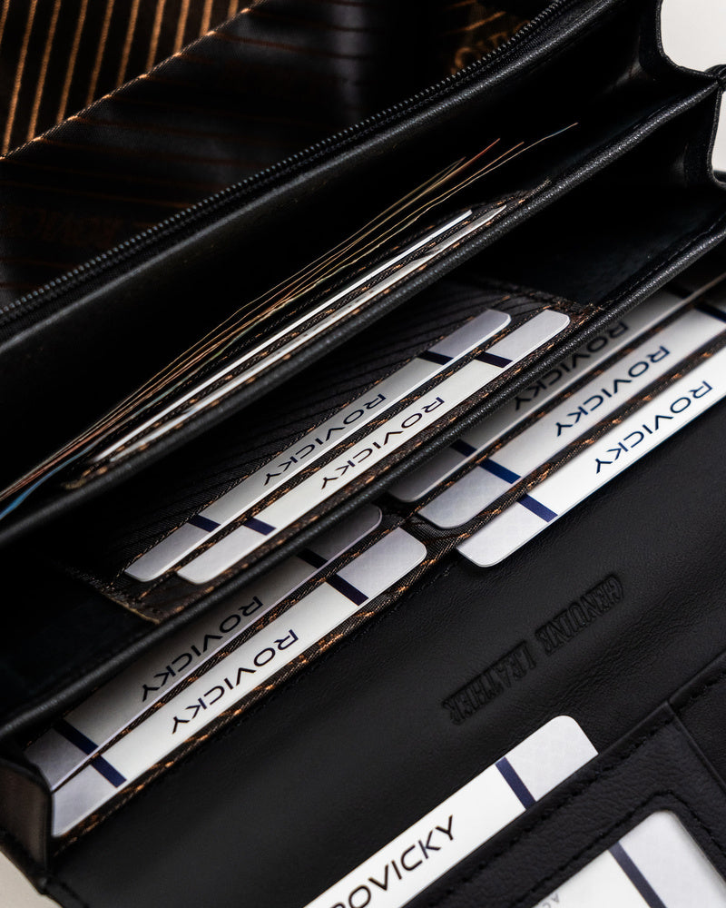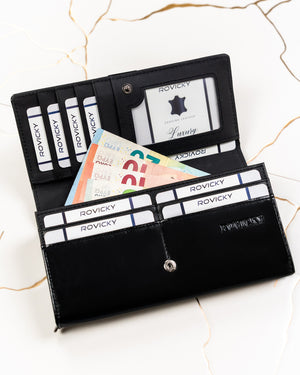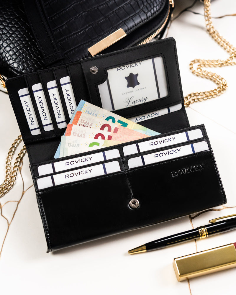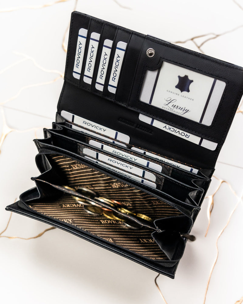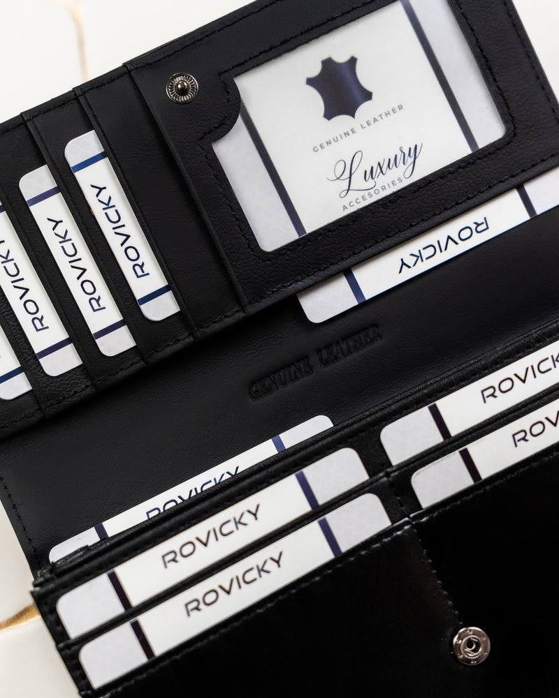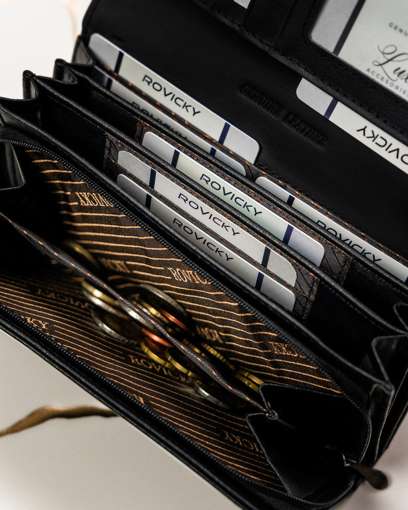 Ši elegantiška juoda piniginė iš natūralios odos yra puikus pasirinkimas moterims, vertinančioms kokybę ir funkcionalumą. Dėl didelio dydžio ir daugybės kortelių skyrių, ji puikiai tiks kasdieniam naudojimui.