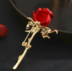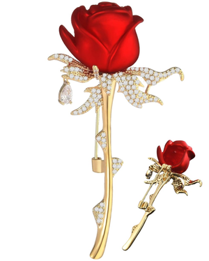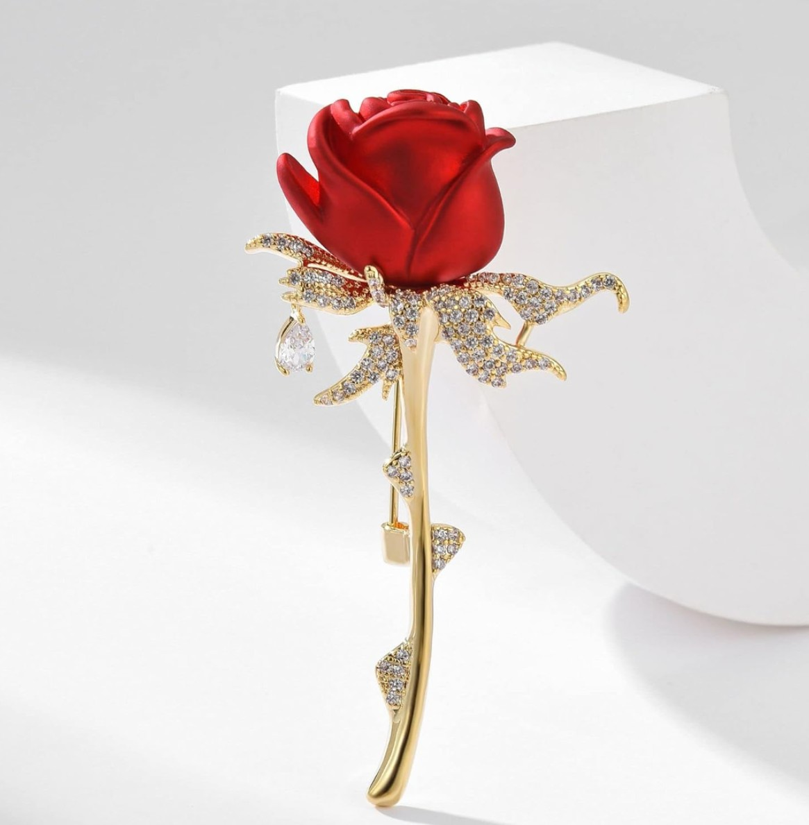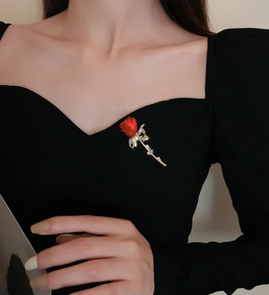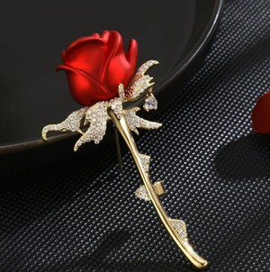 Ši elegantiška sagė su raudona rože yra puikus aksesuaras, suteikiantis jūsų aprangai išskirtinumo ir romantikos.