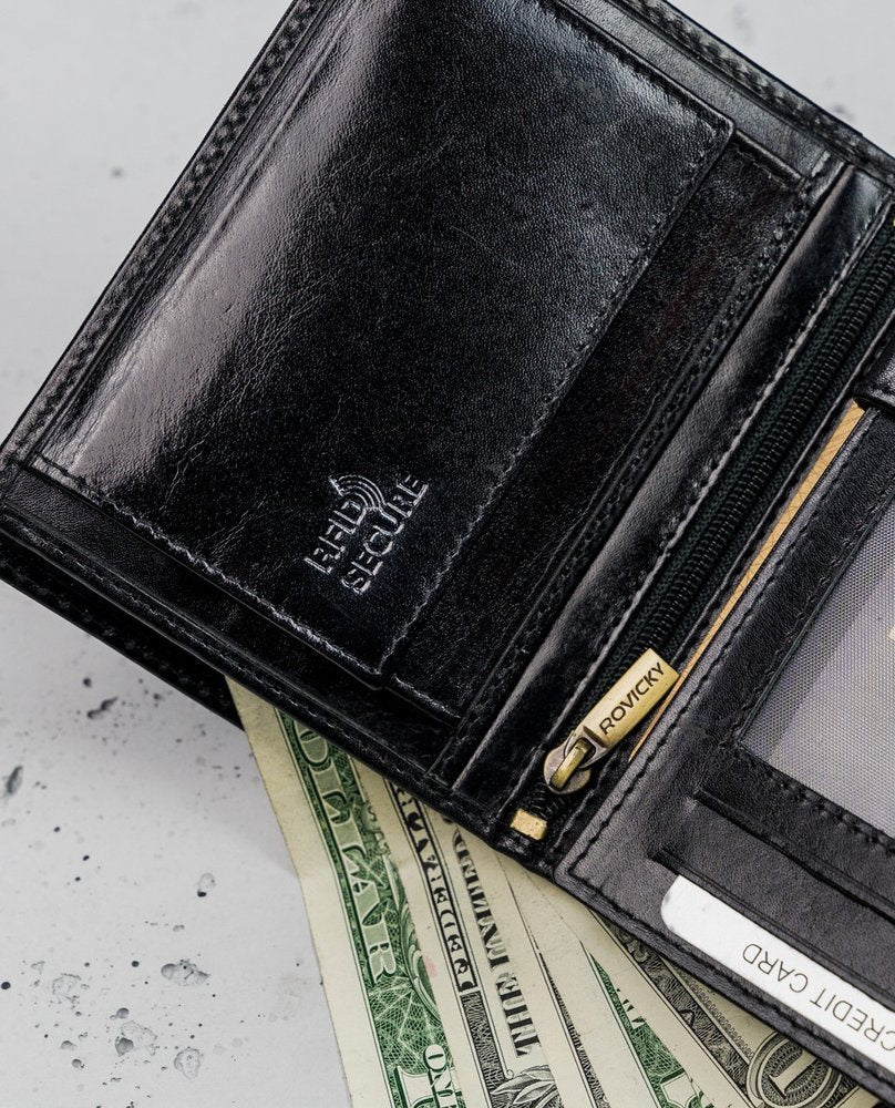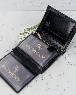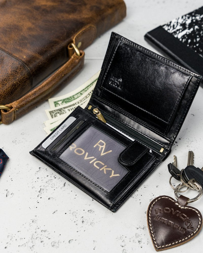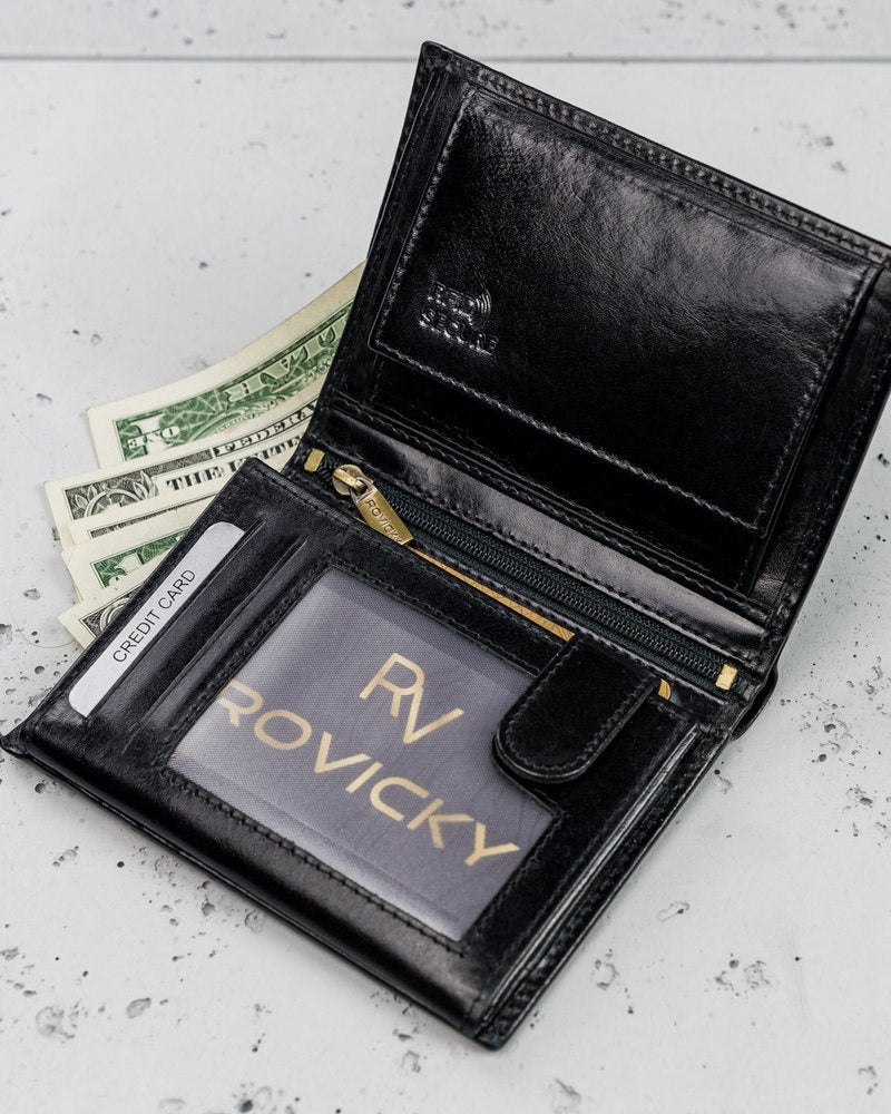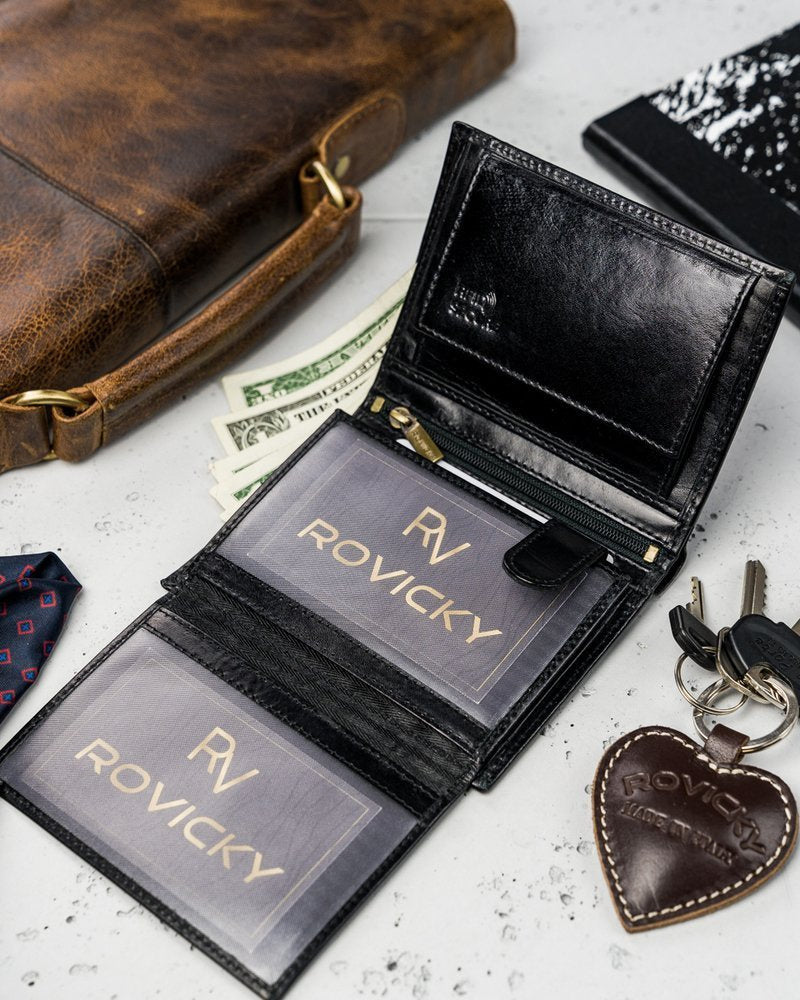 Ši elegantiška vyriška piniginė iš Rovicky yra pagaminta iš aukštos kokybės natūralios odos, kuri užtikrina ilgaamžiškumą ir stilingą išvaizdą. Juoda spalva suteikia klasikinį ir universalų įvaizdį, tinkantį bet kokiai progai.