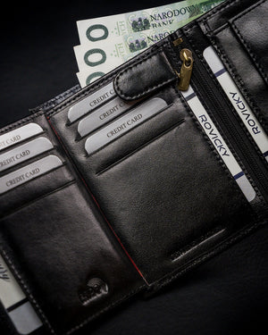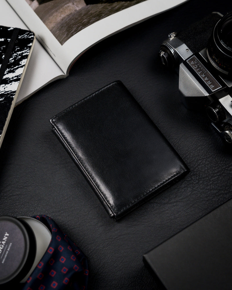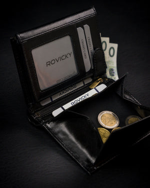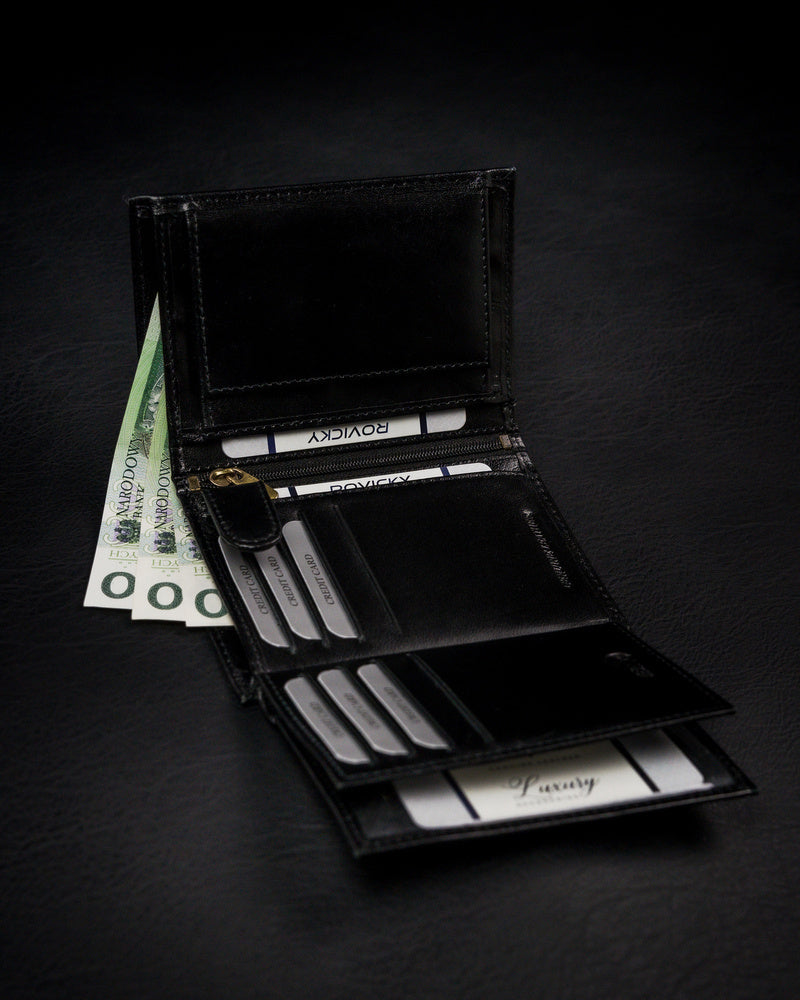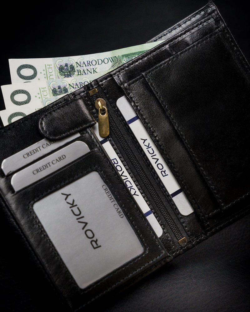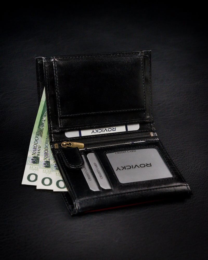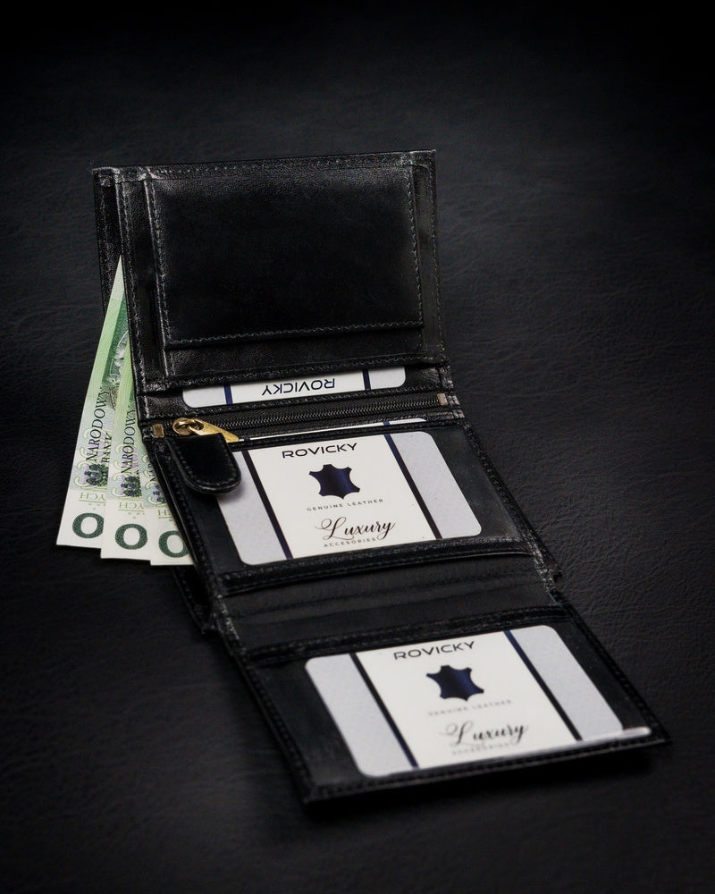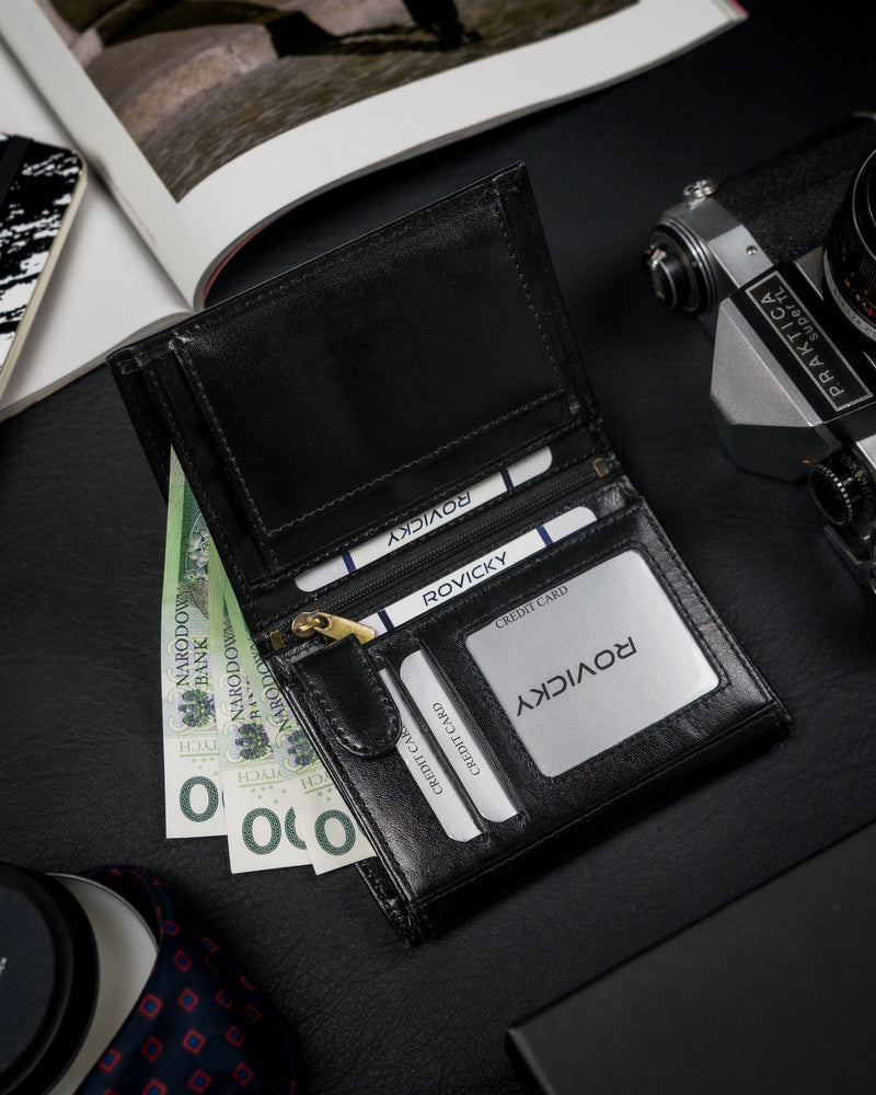 Vyriška odinė piniginė Rovicky RV42 yra elegantiškas ir funkcionalus aksesuaras, pagamintas iš aukštos kokybės natūralios odos. Juoda spalva suteikia klasikinį ir universalų stilių, tinkantį įvairioms progoms. Piniginė yra didelio dydžio, todėl joje patogiai tilps visos jūsų kortelės ir grynieji pinigai. Su 6-10 kortelių skyriais ir RFID apsauga, jūsų asmeniniai duomenys bus saugūs. Išmatavimai 13 cm x 9,5 cm x 3 cm užtikrina, kad piniginė bus patogi nešioti kasdien.