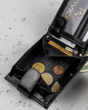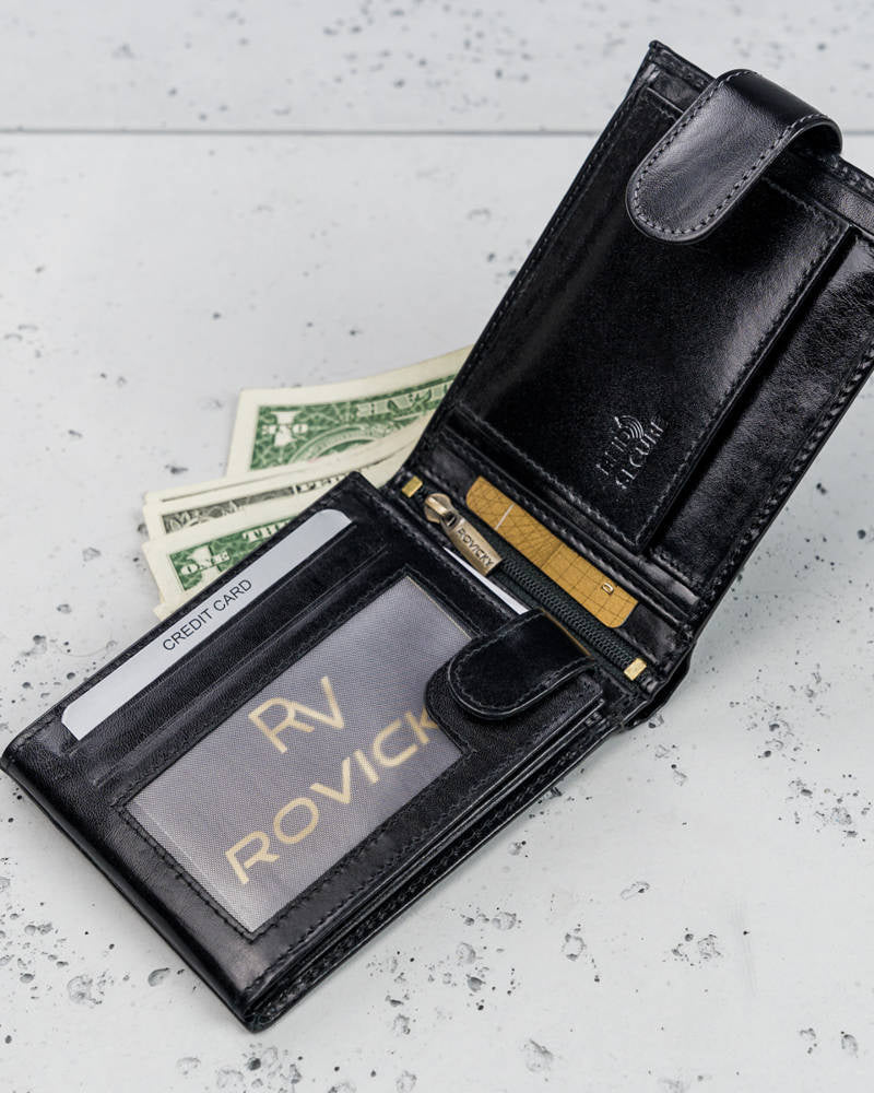 Ši vyriška odinė piniginė Rovicky RV99 yra puikus pasirinkimas tiems, kurie vertina kokybę ir funkcionalumą. Pagaminta iš natūralios odos, ji ne tik atrodo elegantiškai, bet ir yra patvari. Juoda spalva suteikia klasikinį ir universalų stilių, tinkantį bet kokiai progai.