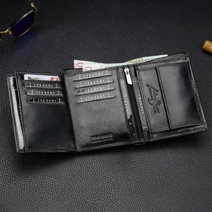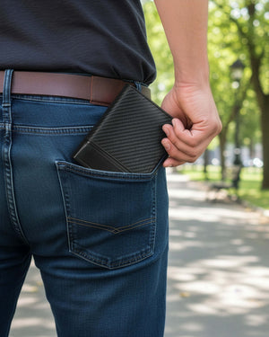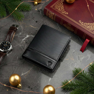Vertikali vyriška piniginė, pagaminta iš natūralios veršiuko odos su specialia danga, imituojančia karbono raštą. Tvirta, atspari kasdieniam dėvėjimui ir papildomai apsaugota RFID technologija. Matmenys: 12,5 × 10 × 2 cm.