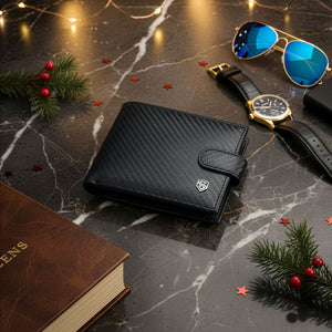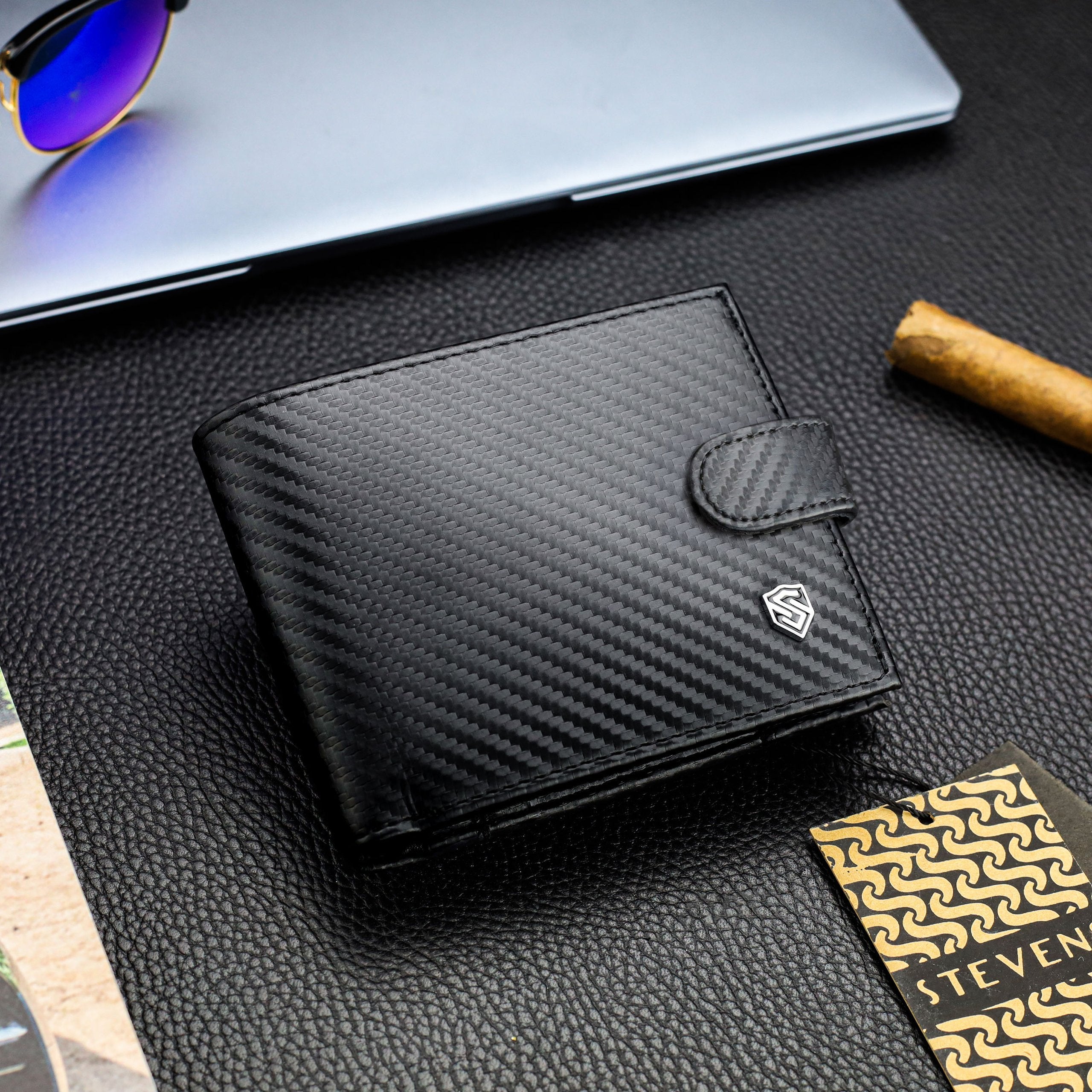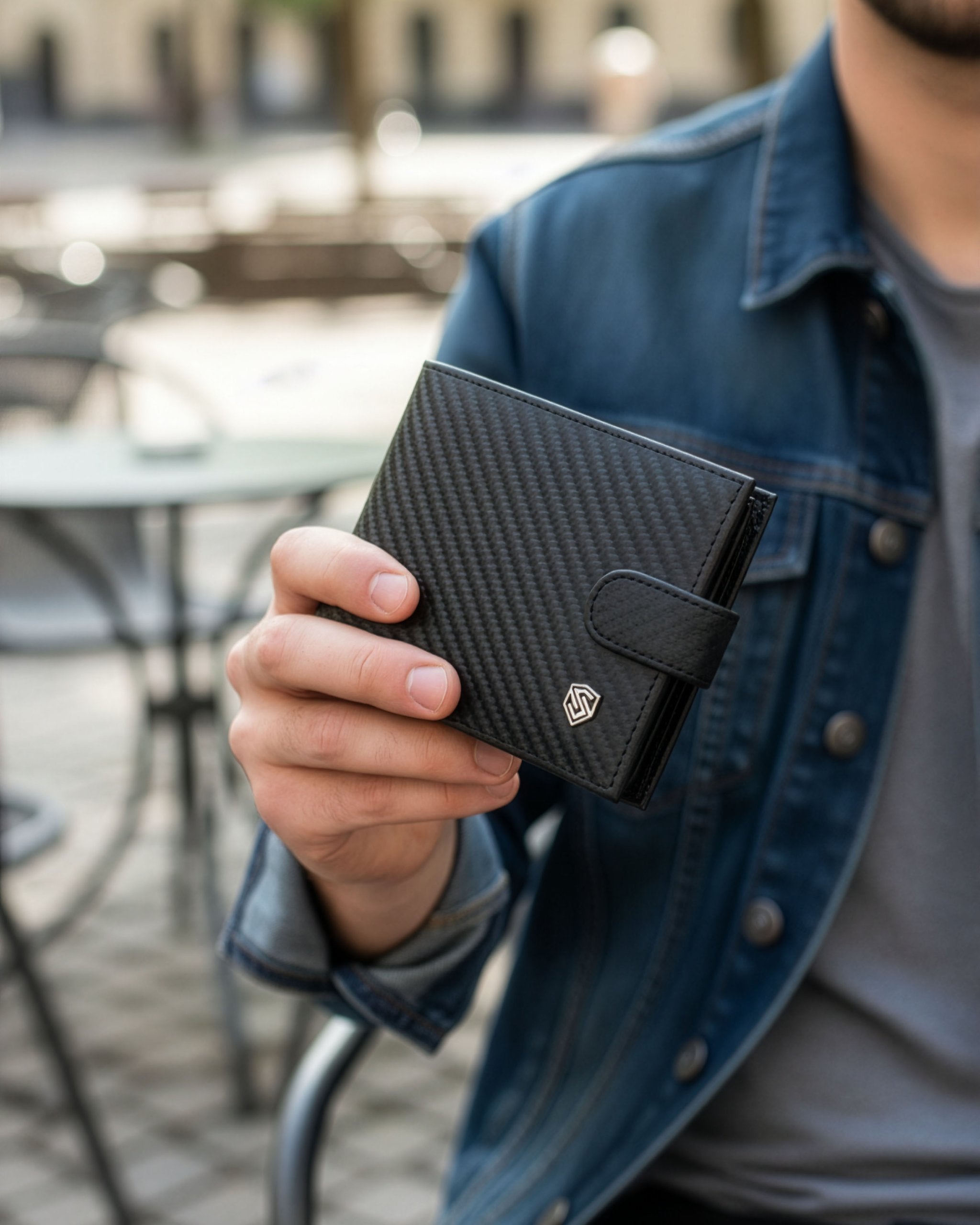 Horizontali vyriška piniginė, pagaminta iš aukštos kokybės veršiuko natūralios odos. Paviršius padengtas specialia danga, primenančia karbono (anglies pluošto) faktūrą – tai suteikia modernią išvaizdą ir geresnę apsaugą nuo kasdienių pažeidimų.