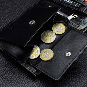 Monetoms skirtas skyrius užsegamas spaude – patogu naudoti ir saugu, kad smulkūs pinigai neišbyrėtų.