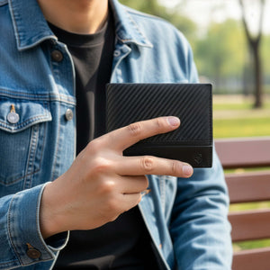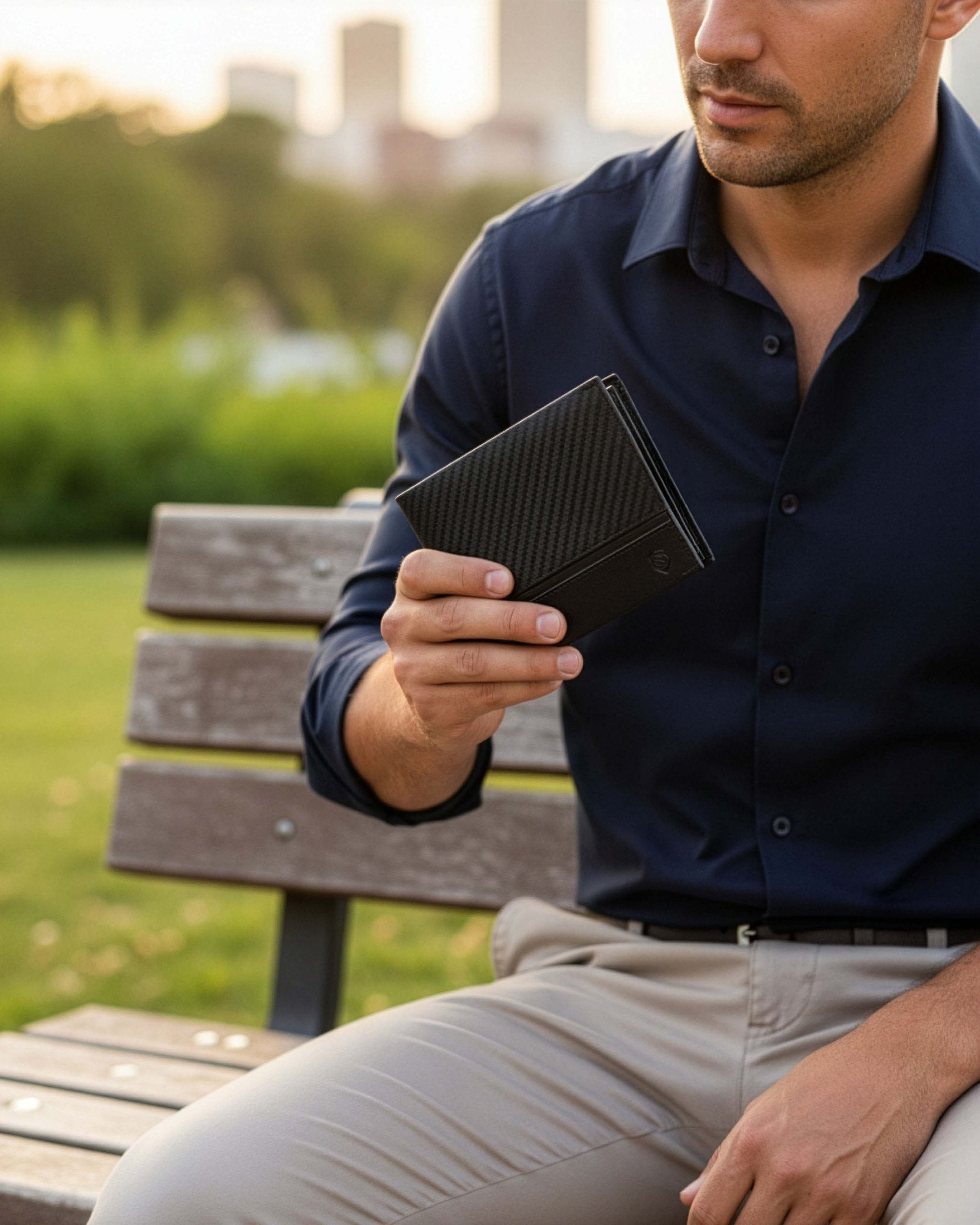 Piniginėje integruotas specialus RFID sluoksnis, paslėptas tarp viršutinio odos sluoksnio ir vidaus pamušalo. Kol kortelės yra piniginėje, bekontaktiniai skaitytuvai negali nuskaityti jų duomenų.