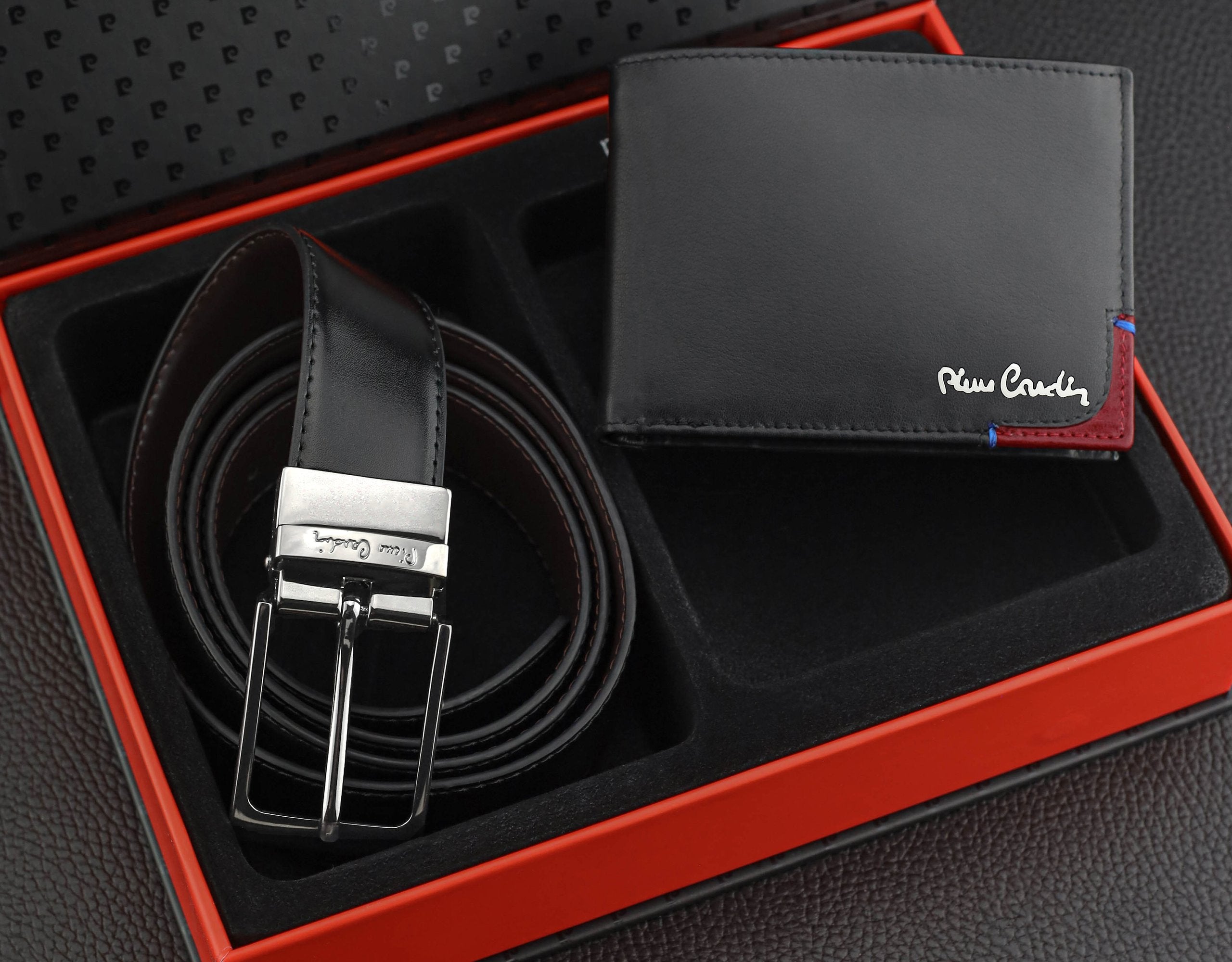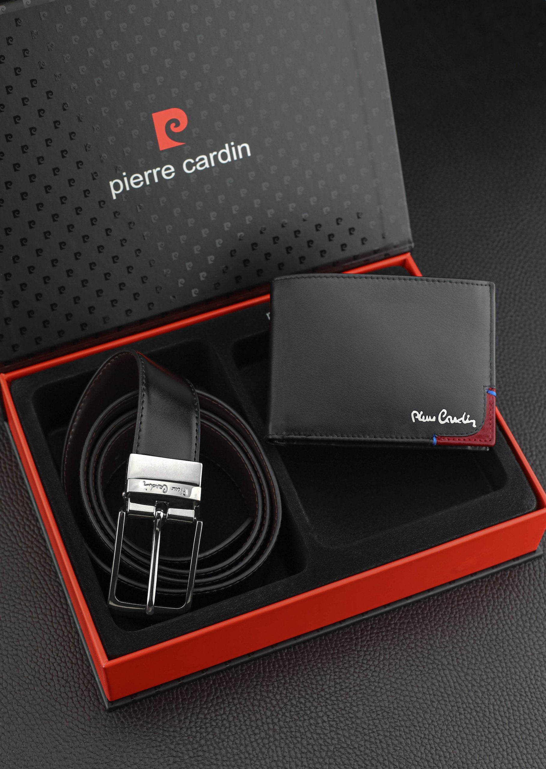 „Pierre Cardin“ dovanų rinkinys: piniginė, dvipusis diržas, dėžutė, dovanų maišelis