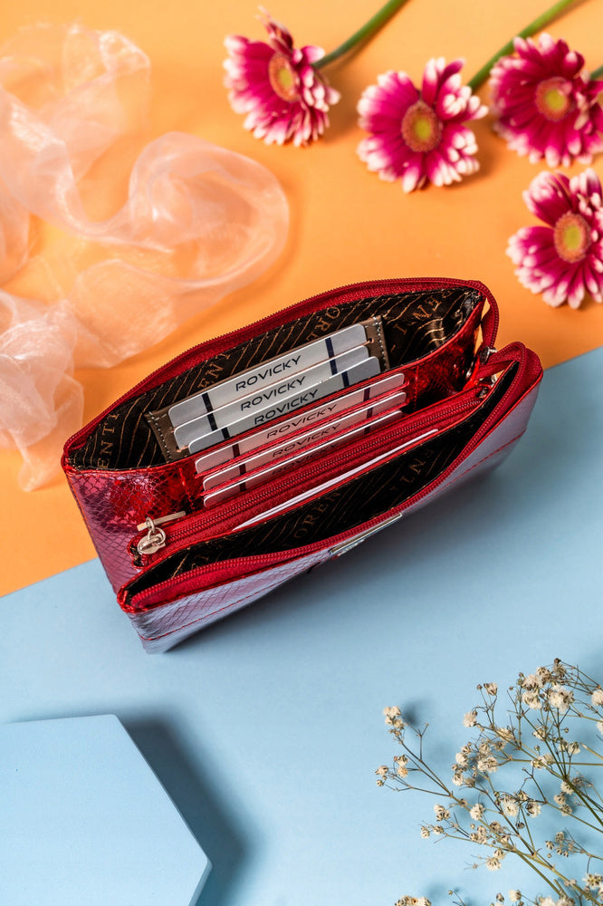 Ši elegantiška moteriška piniginė pagaminta iš minkštos natūralios odos, kuri suteikia prabangos pojūtį. Priekinę dalį puošia subtili juostelė, dekoruota cirkoniais, suteikianti papildomo žavesio.