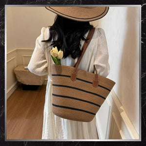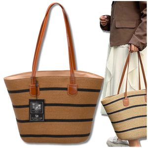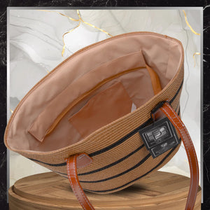 Ši elegantiška moteriška paplūdimio rankinė iš Bad&Bags yra puikus pasirinkimas vasaros sezonui. Pagaminta iš aukštos kokybės pintos sintetinės medžiagos, ji pasižymi natūralia/bežine spalva su rudais elementais, suteikiančiais stilingą išvaizdą.