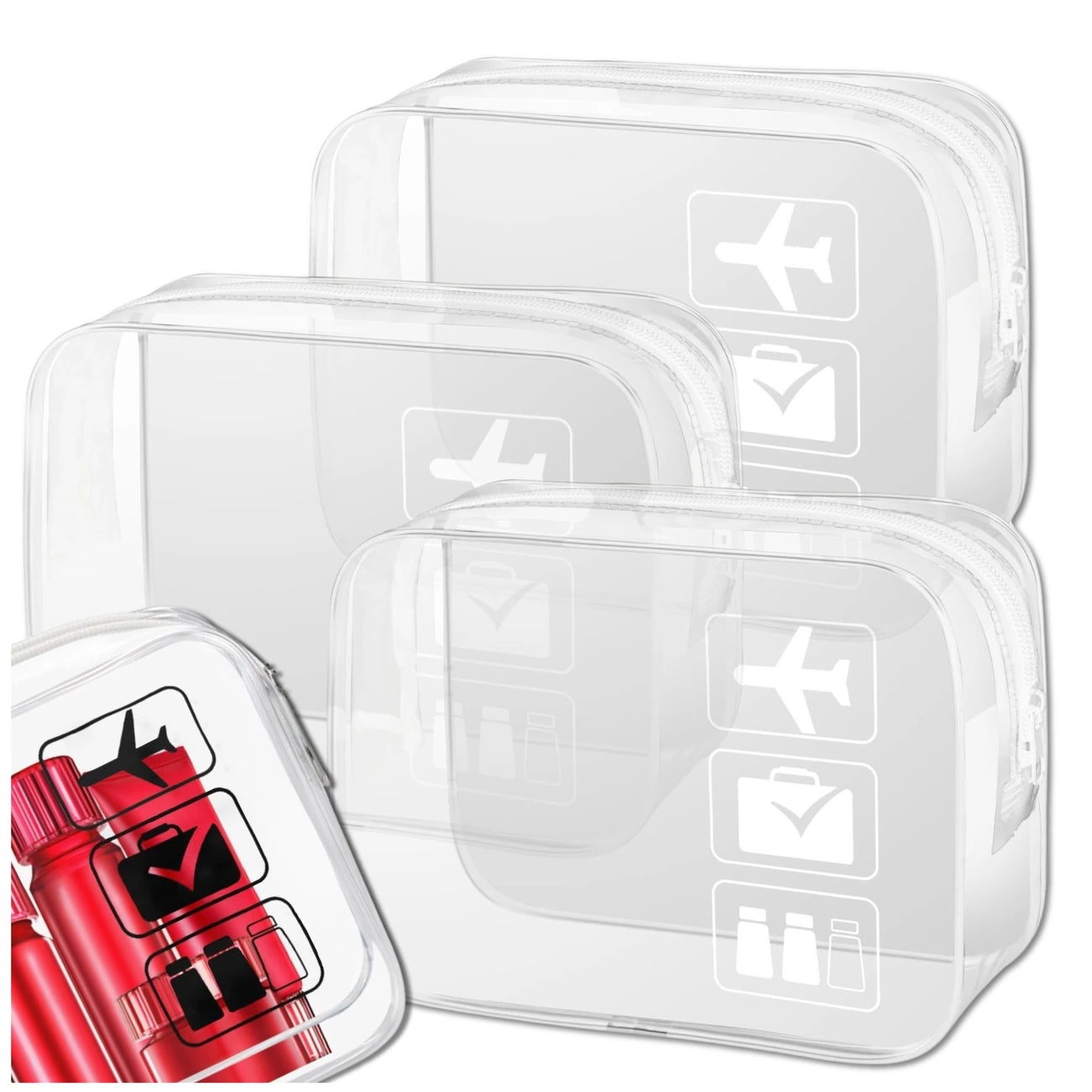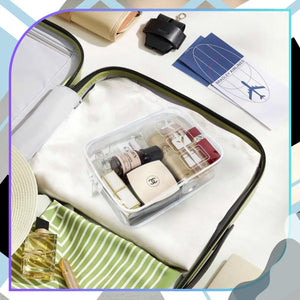 Šis rinkinys, sudarytas iš trijų skaidrių kosmetinių, yra puikus pasirinkimas kelionėms. Kiekviena kosmetinė yra pagaminta iš patvaraus PVC su elegantiška balta apdaila, užtikrinančia ilgaamžiškumą ir stilių.
