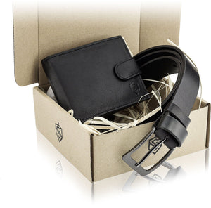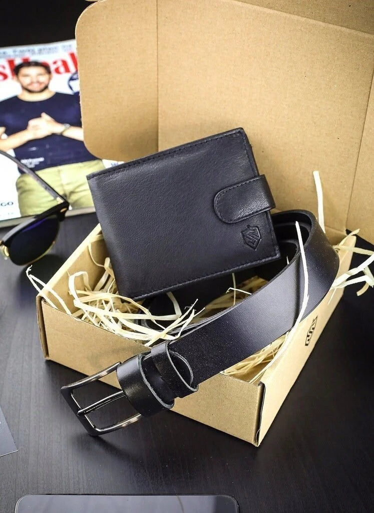 Horizontali vyriška piniginė iš prabangios veršiuko odos ir natūralios odos diržas su elegantiška sagtimi. Komplekte – stilinga dovanų dėžutė. Paruoštas, solidus ir praktiškas pasirinkimas reikliam vyrui.