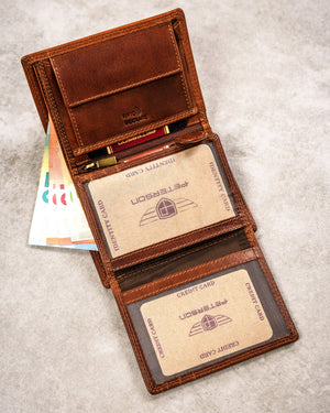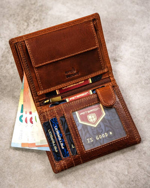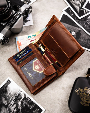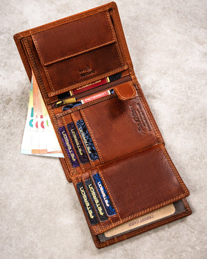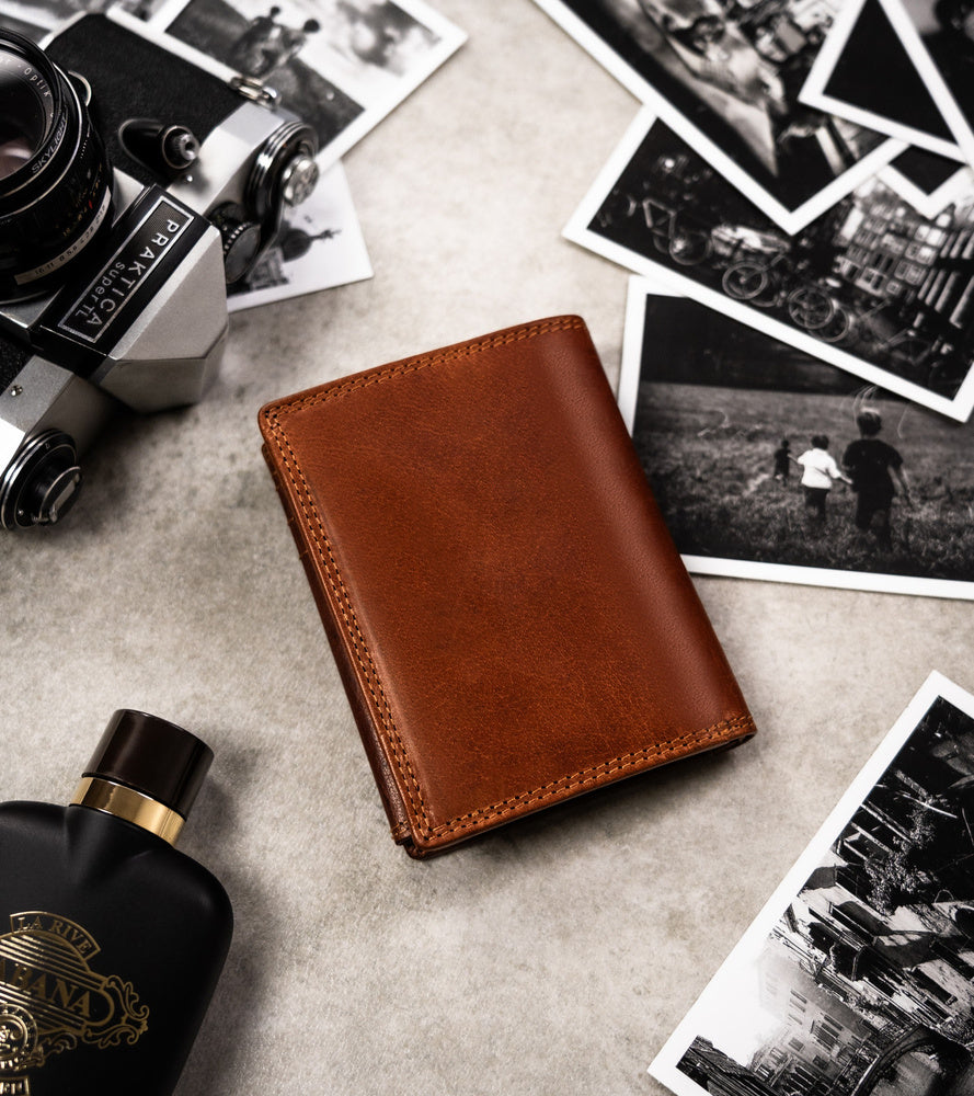 Ši natūralios odos piniginė yra puikus pasirinkimas vyrams, vertinantiems kokybę ir funkcionalumą. Jos šviesiai ruda spalva suteikia elegancijos, o RFID apsauga užtikrina jūsų kortelių saugumą.