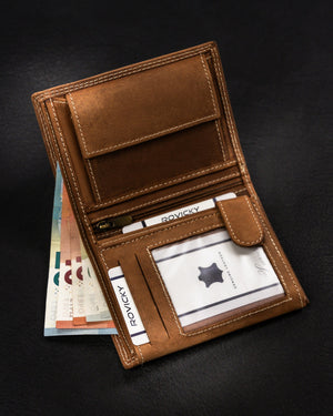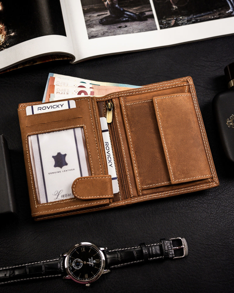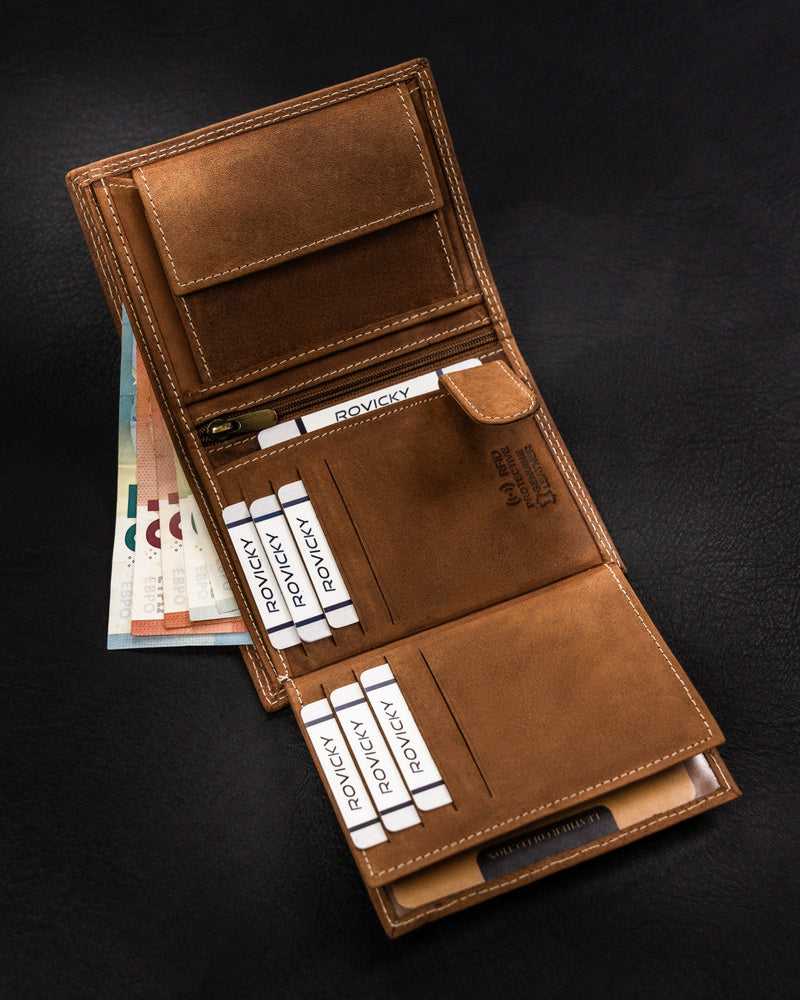 Ši vyriška piniginė iš Always Wild kolekcijos yra pagaminta iš aukštos kokybės natūralios zomšos ir nubuko odos, suteikiančios elegantišką ir patvarų dizainą. Šviesiai ruda spalva puikiai dera prie įvairių stilių, o didelis dydis užtikrina, kad turėsite pakankamai vietos visiems savo reikmenims. Piniginė turi 6-10 kortelių skyrius, todėl galėsite patogiai laikyti visas savo korteles. Be to, integruota RFID apsauga padės apsaugoti jūsų asmeninius duomenis nuo neteisėto nuskaitymo. Išmatavimai 13 cm x 9,5 cm x 2,5 cm užtikrina, kad piniginė bus patogi ir praktiška kasdieniam naudojimui.